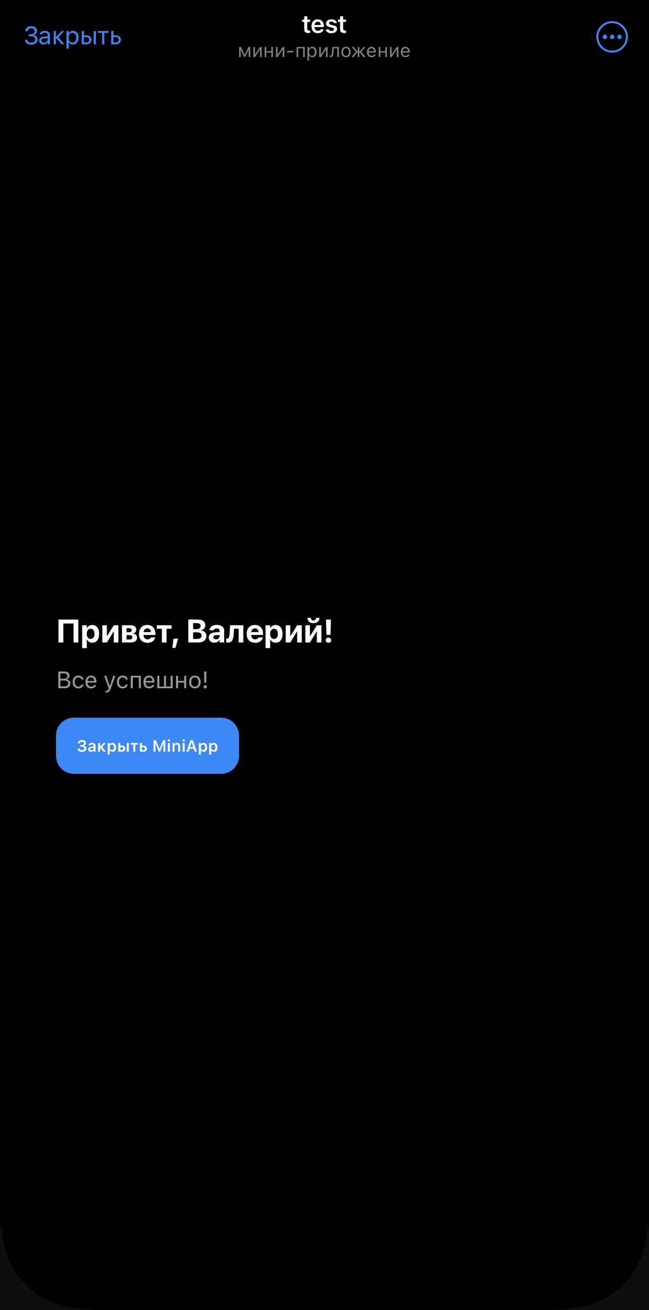 Приложение работает по следующему принципу: если initData валидный, то отображается Mini App с приветствием по full_name, кнопкой "Закрыть Mini App" и темой пользователя. Если же он невалидный или сайт будет открыт не через Mini App - будет написано об ошибке.