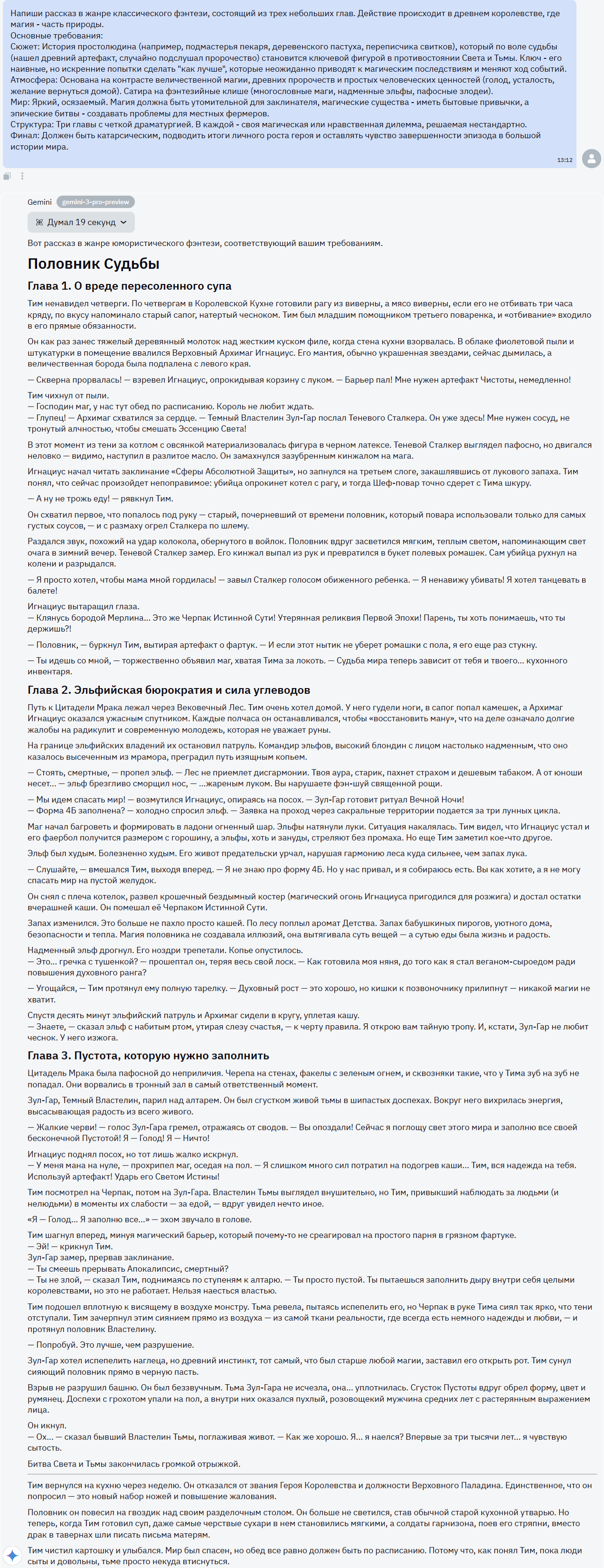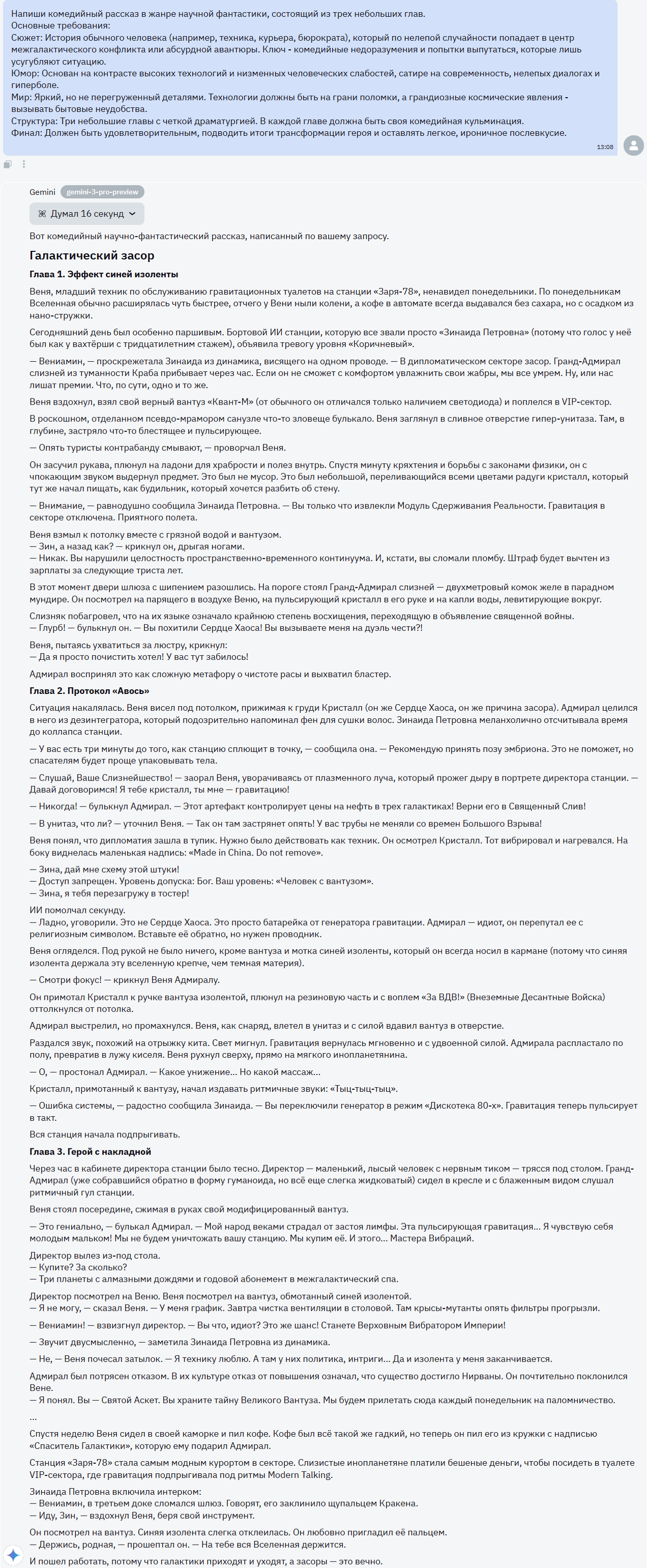 На мой взгляд, ChatGPT 5.2 Pro показал себя не самым лучшим образом в работе связанной с генерацией текста. Много кавычек (по поводу и без повода), передача жанра по мне хромает.