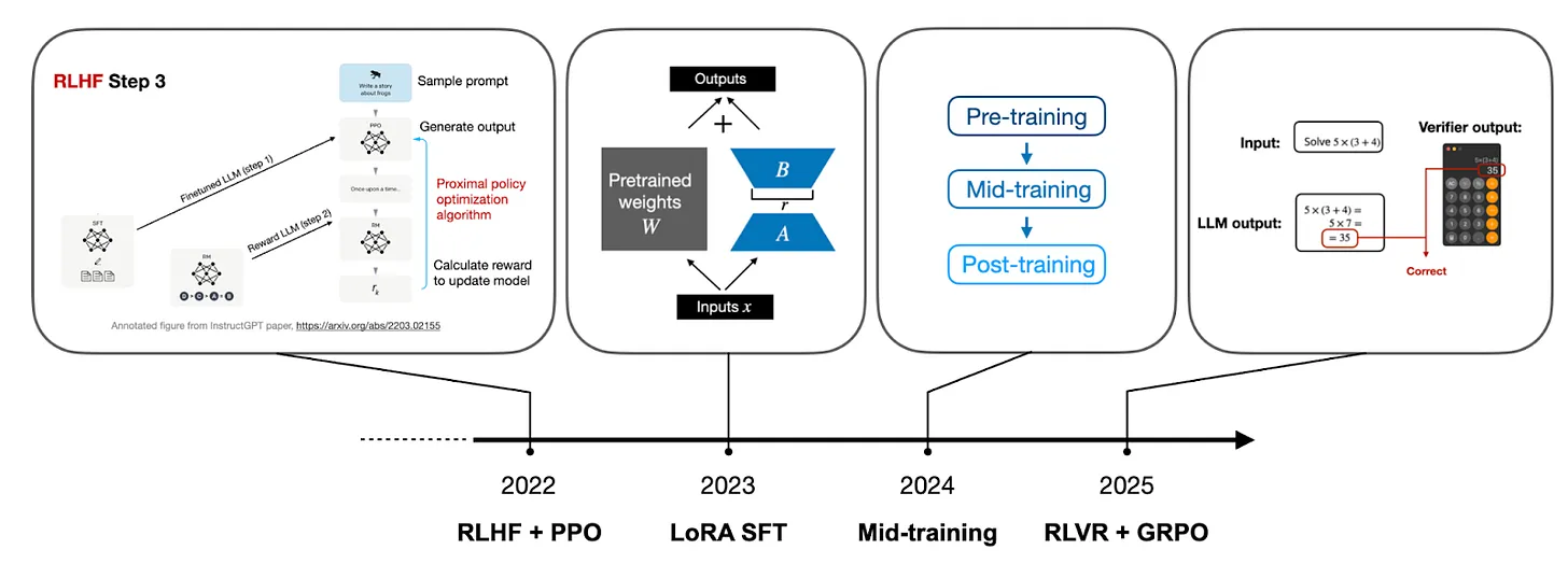 Тогда я рассматривал их как техник�� предобучения, поскольку они используют тот же алгоритм и цель предобучения. Сегодня эти несколько более специализированные этапы предобучения, которые следуют за обычным предобучением на общих данных, часто называют «промежуточным обучением» — как мост между обычным предобучением и дообучением (или постобучением), включающим SFT, RLHF и теперь RLVR.