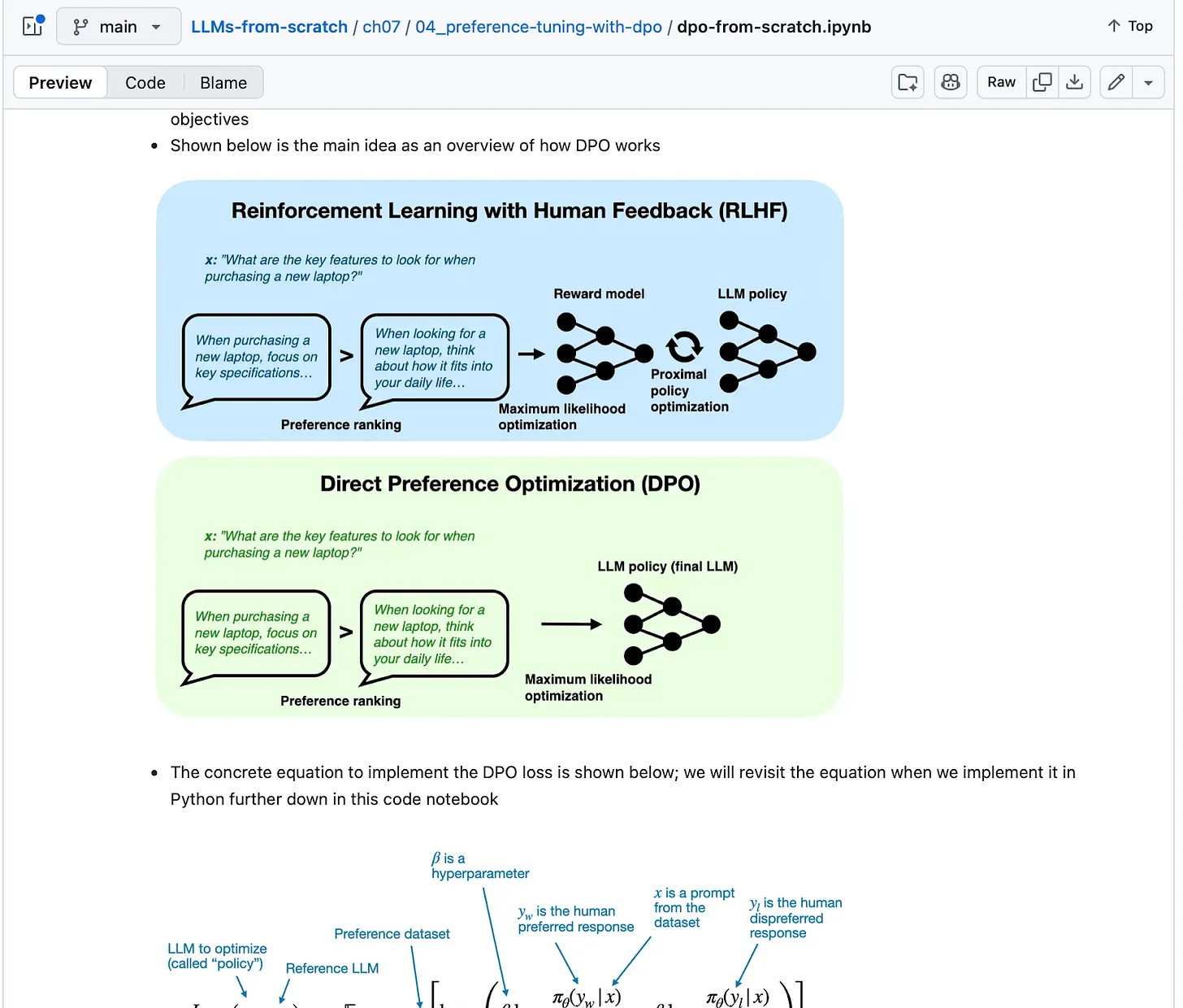Еще один пример — DPO (Direct Preference Optimization, прямая оптимизация предпочтений: Your Language Model is Secretly a Reward Model) и связанные методы выравнивания без модели наград (reward-model-free alignment) как альтернатива обучению с подкреплением на основе обратной связи от человека.