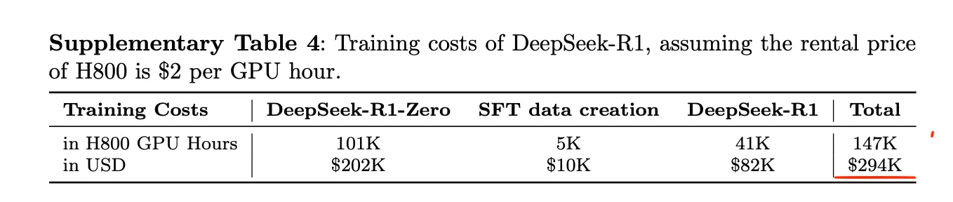 В дополнительных материалах к DeepSeek R1 стоимость обучения модели R1 поверх V3 оценивается в $294 000, что опять же намного ниже, чем все предполагали.
