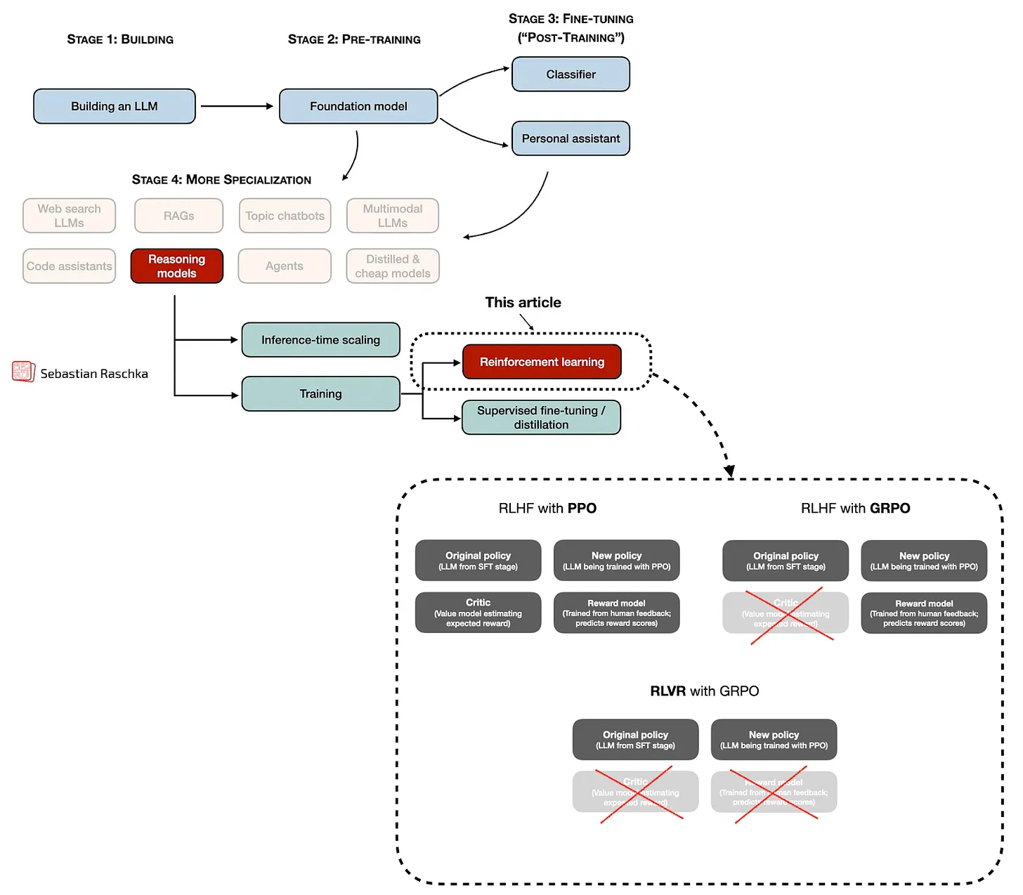 Не буду углубляться в технические детали — в годовом обзоре нужно охватить и другие темы. О моделях рассуждений и RLVR можно написать целые статьи или даже книги. Например, если вас интересует более подробная информация, ознакомьтесь с моими предыдущими статьями: «Понимание рассуждающих LLM» (Understanding Reasoning LLMs) и «Состояние обучения с подкреплением для рассуждений LLM» (The State of Reinforcement Learning for LLM Reasoning).