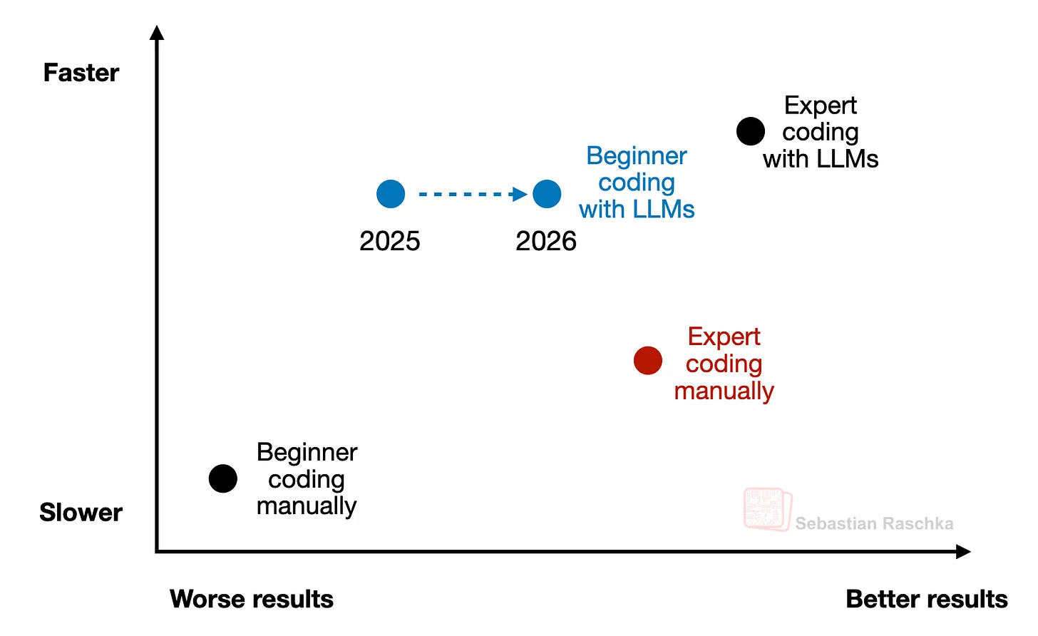 Но я также полагаю, что здесь ключевой момент заключается в том, чтобы научиться распознавать, когда использовать LLM, а когда нет. Например, главный недостаток в том, что может возникнуть соблазн сразу использовать LLM, когда тема становится сложной, потому что самостоятельная борьба с проблемой сначала часто приводит к намного более сильному обучению.
