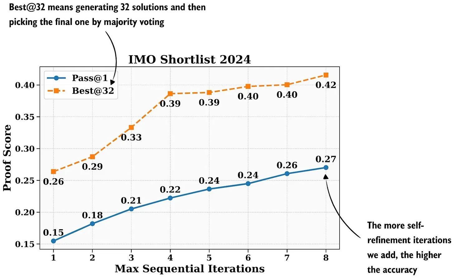 Масштабирование инференса — не новая парадигма, и платформы LLM уже используют определенные техники под капотом. Это компромисс между задержкой, стоимостью и точностью ответа. Однако в определенных приложениях, где точность важнее задержки и стоимости, экстремальное масштабирование инференса может полностью себя оправдать. Например, как показала недавняя статья о DeepSeekV2-Math, это подняло модель до производительности золотого уровня на бенчмарке математических соревнований.