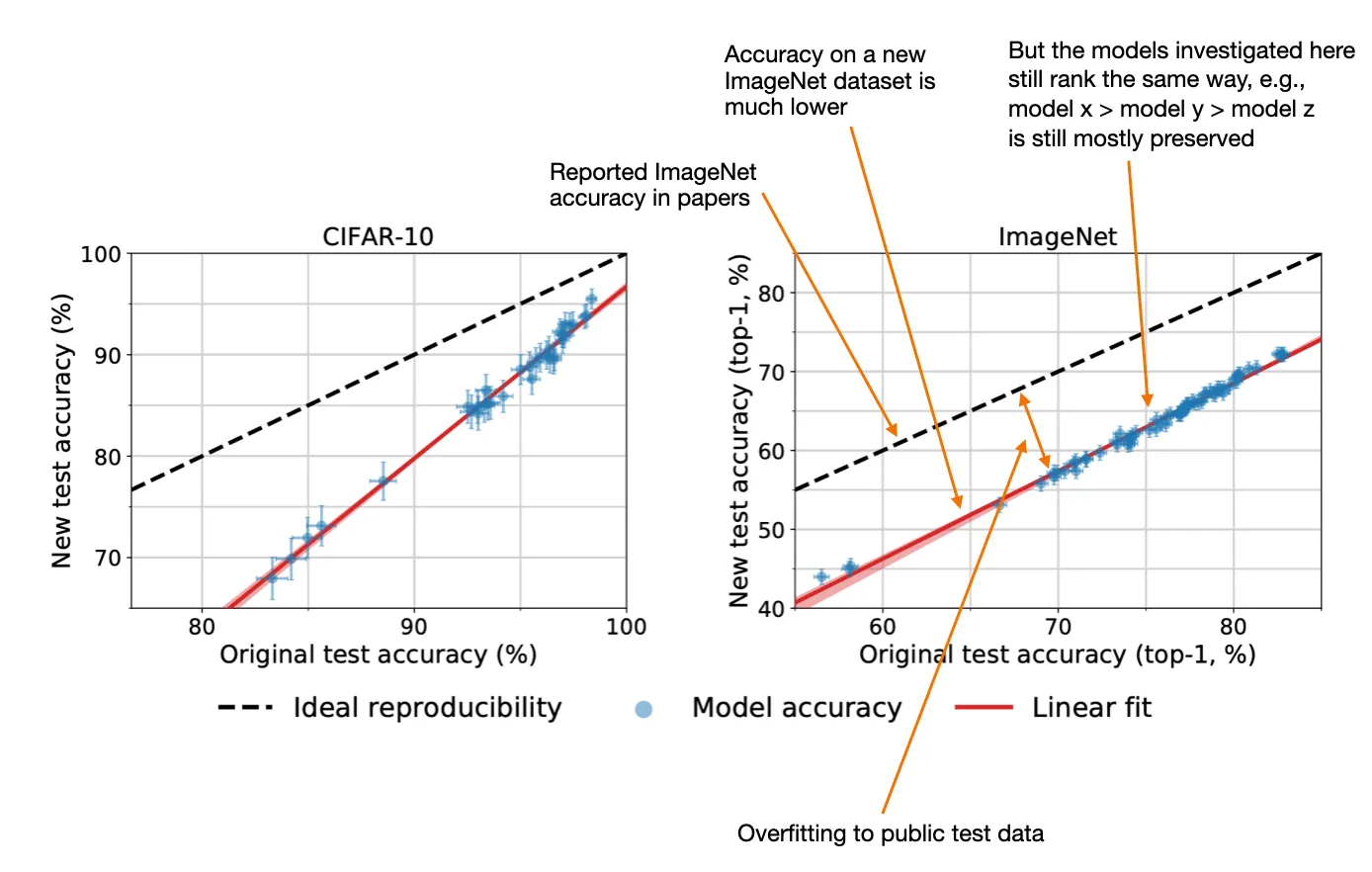 В прошлом, даже если оценки на бенчмарках по публичным тестовым наборам были завышены, по крайней мере ранжирование моделей все же сохранялось. Например, см. аннотированный рисунок из статьи 2019 года «Do ImageNet Classifiers Generalize to ImageNet?» ниже.
