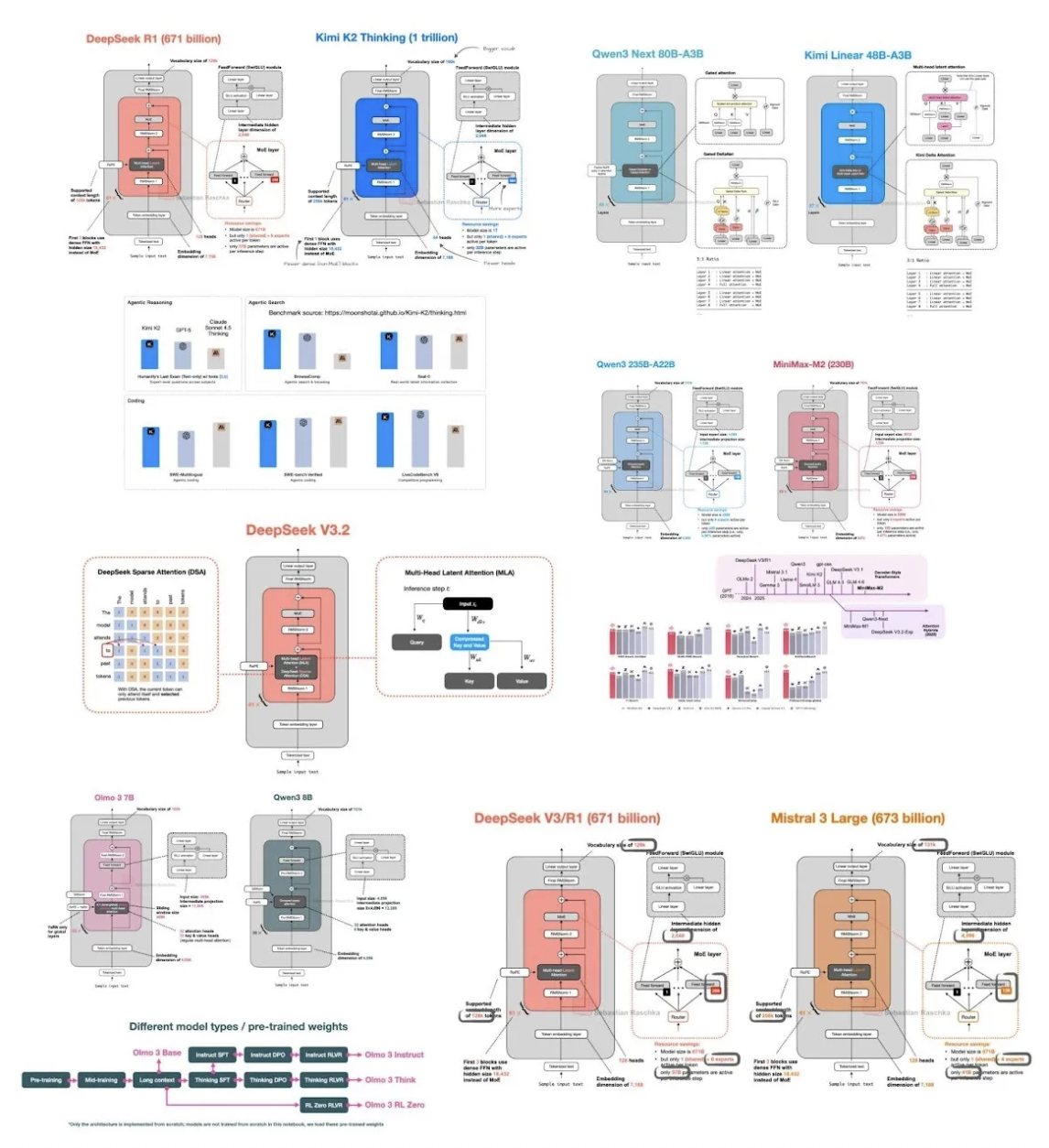 Эти LLM даже не обязательно должны быть полностью обучены с нуля; многие современные LLM, такие как DeepSeek V3.2, Kimi K2 и GLM 4.7, выпускаются с открытыми весами и могут быть адаптированы и дополнительно дообучены.