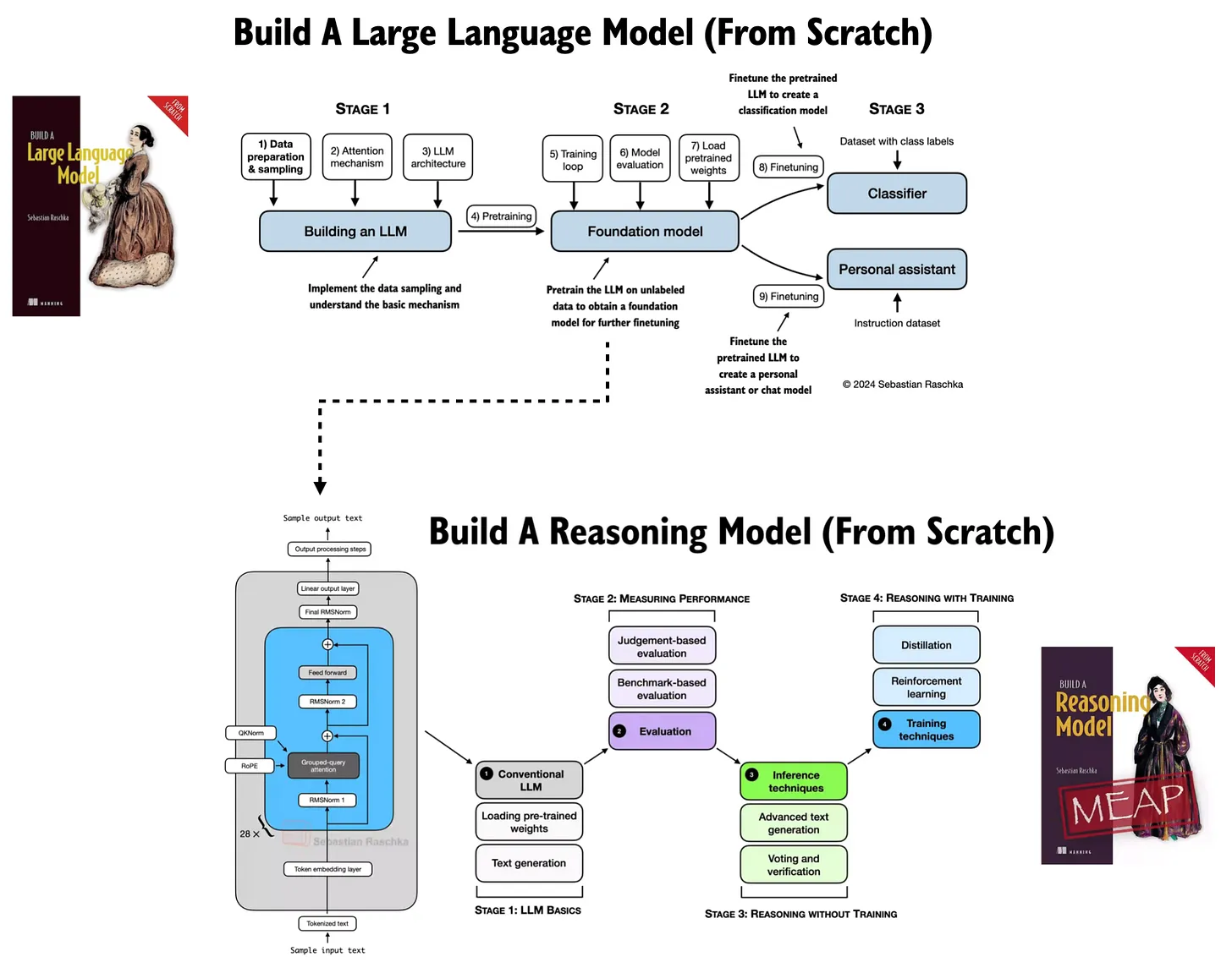Первая книга, «Build A Large Language Model (From Scratch)», фокусируется на основной архитектуре большой языковой модели и основах предобучения.