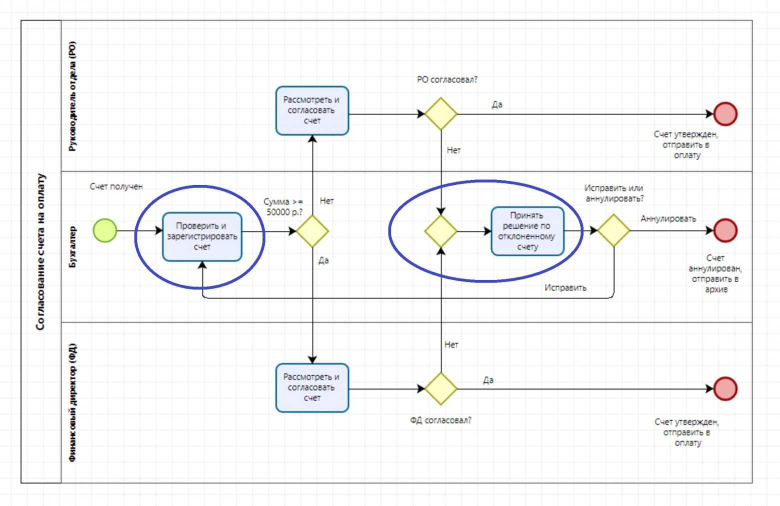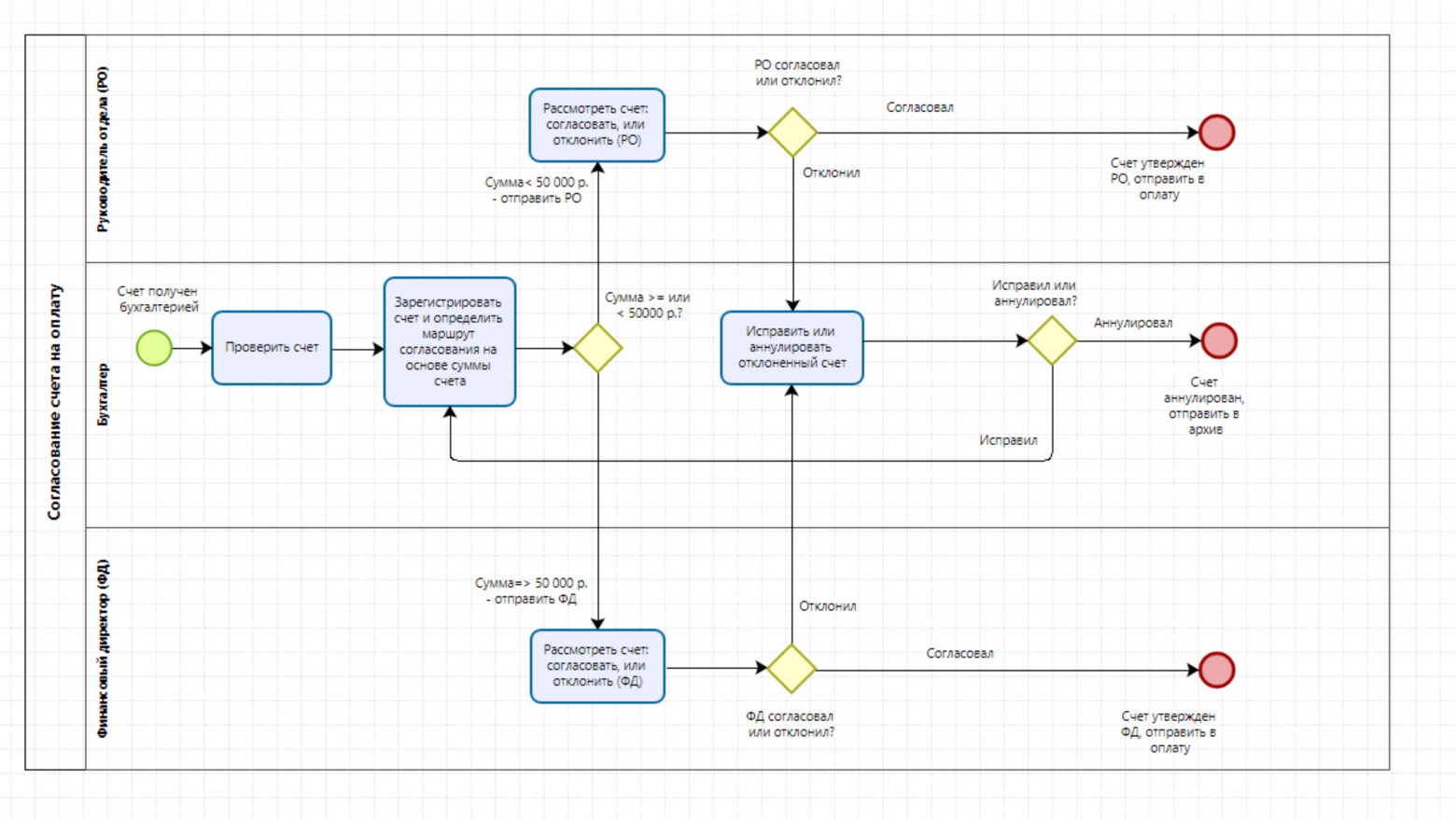 Задача: Бухгалтерия получает счет на оплату от контрагента. Необходимо смоделировать процесс его согласования с момента, когда документ попадает в работу к бухгалтеру, до момента принятия финального решения.