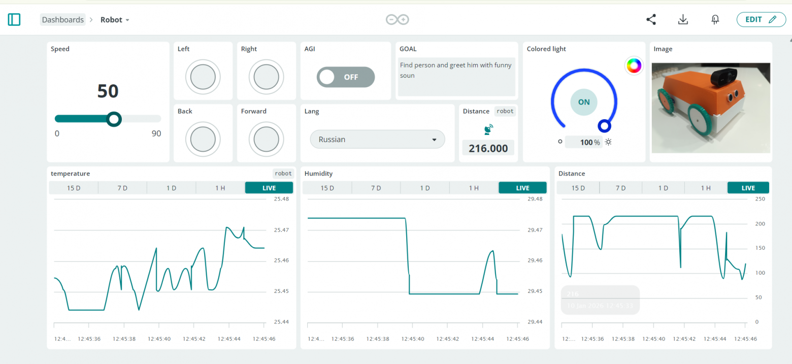 Язык выбирается через Arduino Cloud переменную lang. Меняю в облаке → робот тут же переключается.