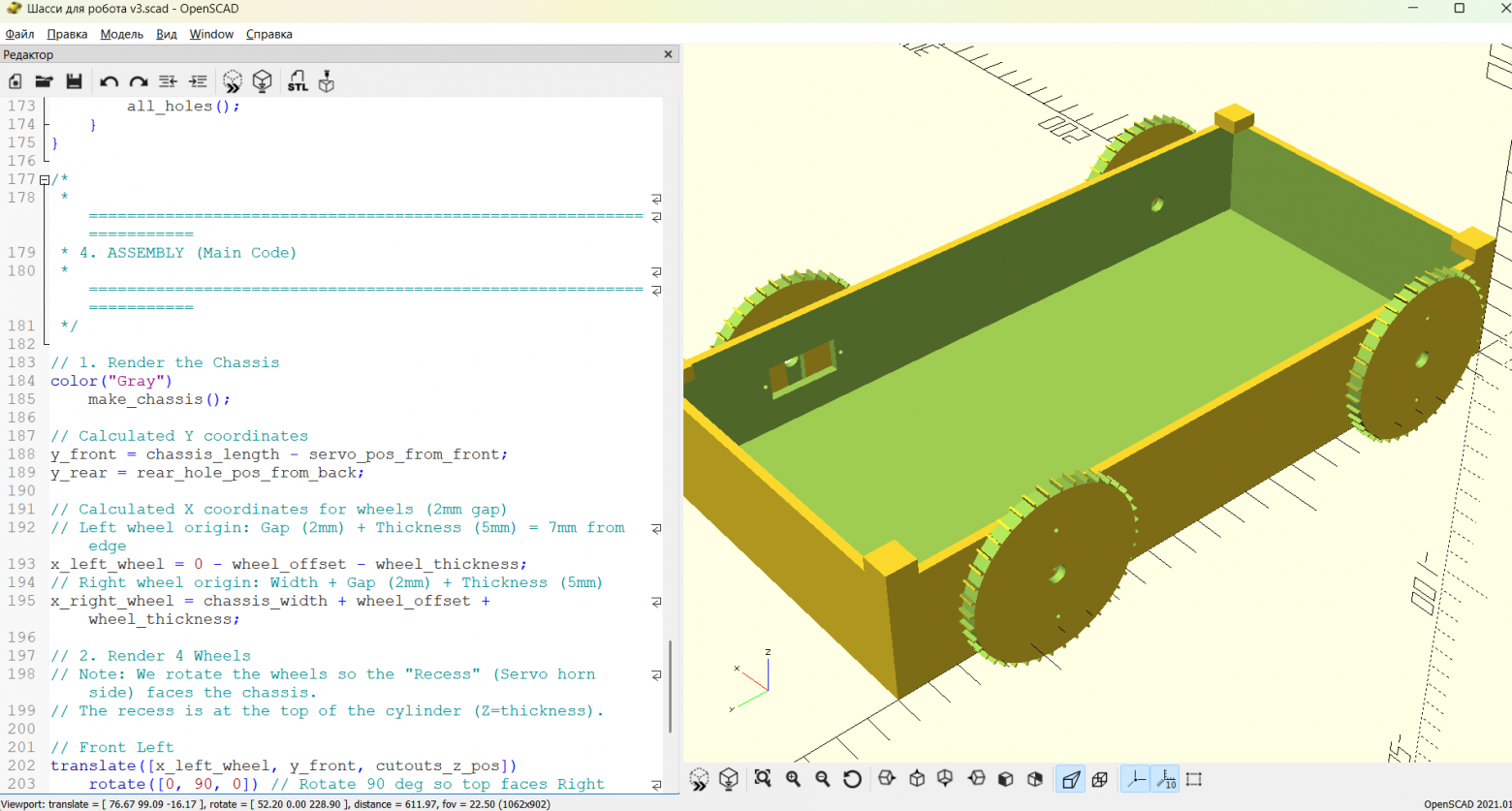Для разработки кастомных шасси, кабины и колес использовался OpenSCAD. Люблю его за параметризацию: