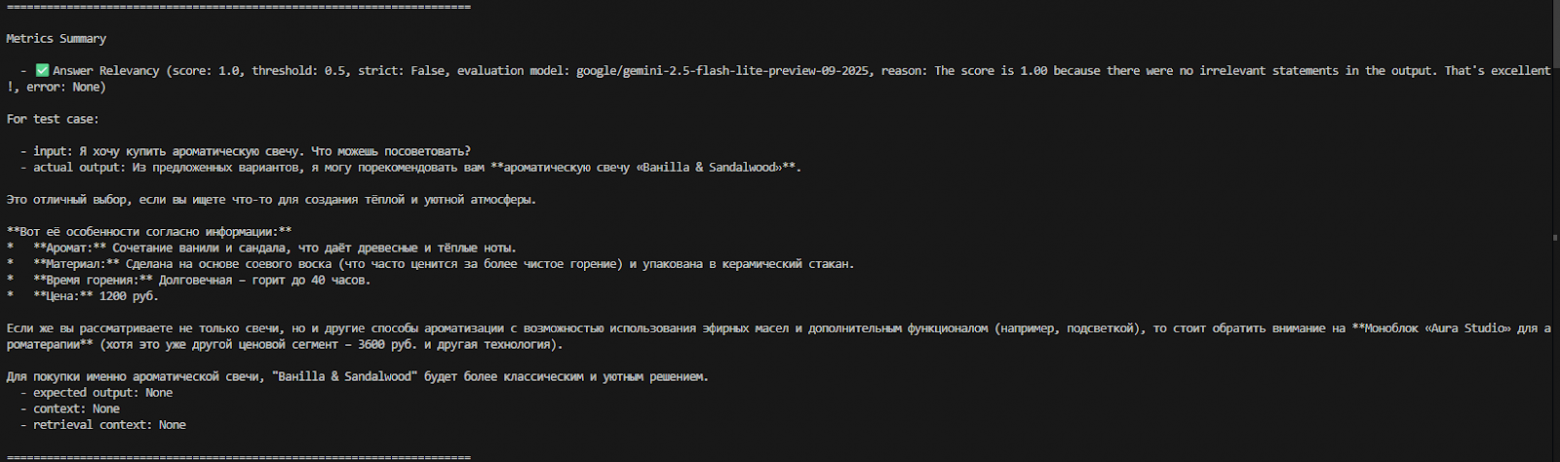 В этой статье были разобраны базовые концепции библиотеки DeepEval, а также приведен практический пример использования этого инструмента в реальном проекте. Данная информация не является исчерпывающей. DeepEval содержит еще много интересного функционала, который доступен в официальной документации. Обязательно изучите ее!