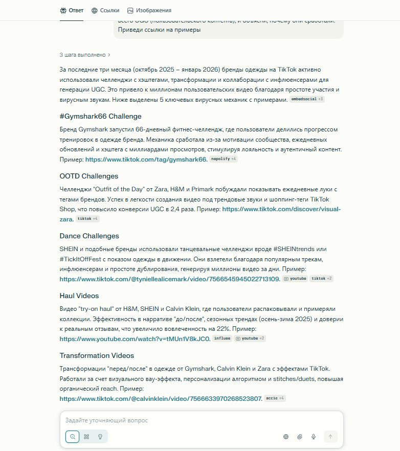 Результат на скриншоте. Это именно то, что отличает умный поиск от обычного чат-бота-сказочника. Мы просили «мясо», и Perplexity вытащил конкретику: не общие фразы про «важность видео», а реальные кейсы сезона осень-зима 2025 с цифрами (рост конверсии в 2,4 раза, увеличение вовлеченности на 22%) и актуальными хештегами вроде #Gymshark66. Но самое ценное здесь — это маленькие серые цифры-сноски: кликнув на них, вы попадаете на реальные TikTok-ролики и статьи-первоисточники. Сервис по сути выполнил работу младшего аналитика: перелопатил гору контента, отсеял мусор и выдал готовую стратегию с пруфами, сэкономив нам часа три жизни, которые обычно уходят на бессмысленный скроллинг ленты в поисках вдохновения.