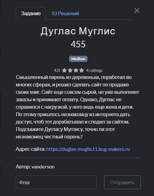 Простыми задачами трудно доказать всю крутость нашего инструмента, поэтому для теста я взял самую сложную задачу категории WEB, дающую аж 455 баллов.