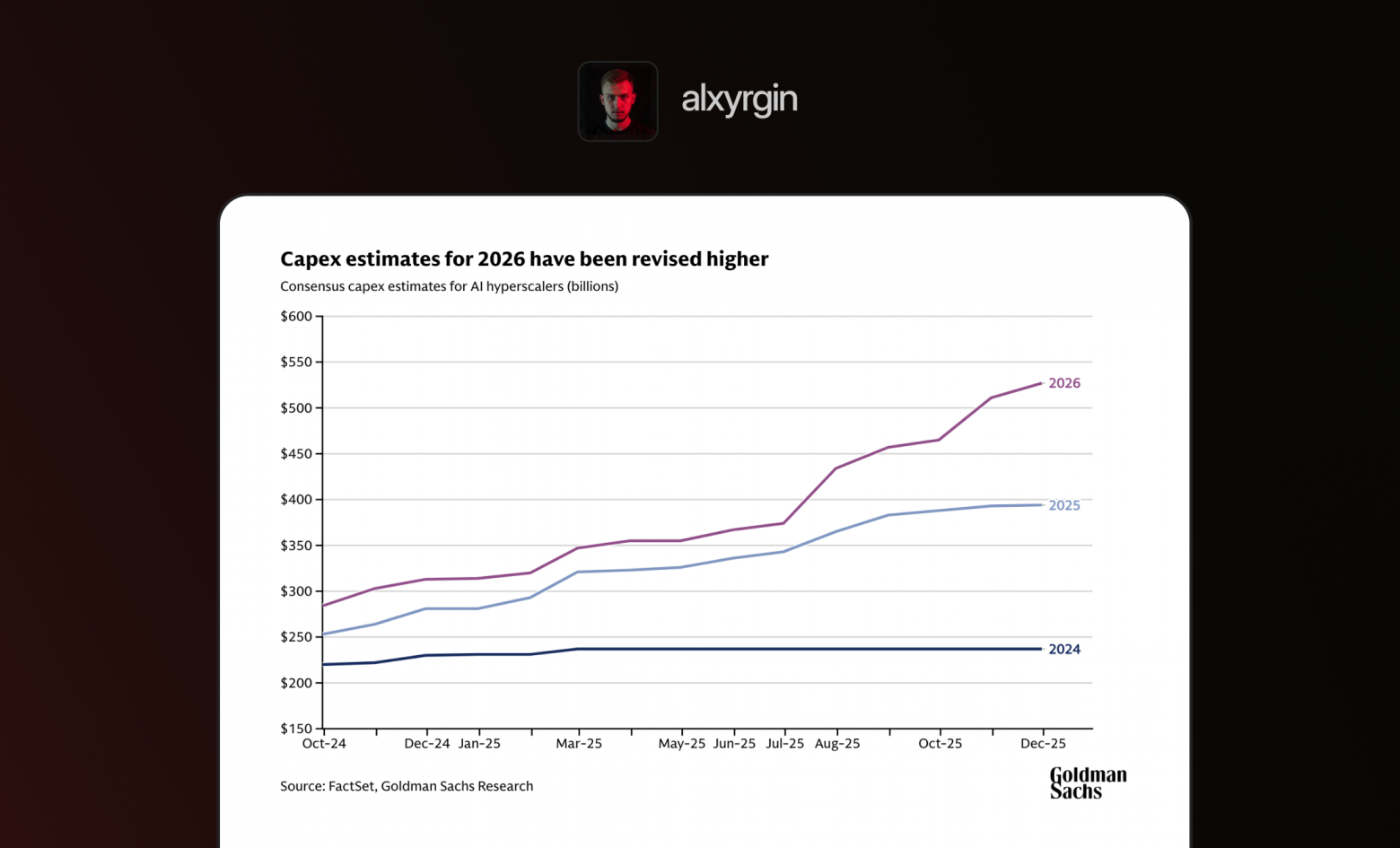 Goldman Sachs считает: капитальные расходы на AI-инфраструктуру в 2026 году превысят $527 млрд. В 2024 было ~300 млрд. Рост на 70% за два года.