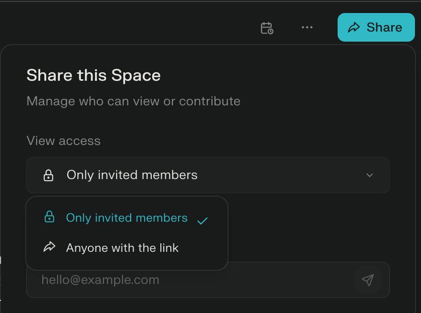 Созданный Space можно оставить приватным, открыть для всех (будет доступен по ссылке даже для пользователей без аккаунта), либо индивидуально пригласить в него по email.