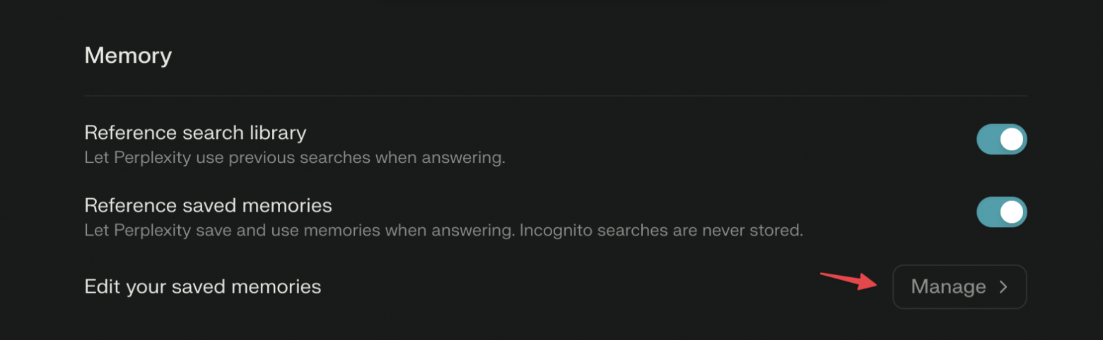 Опция включена по умолчанию. В разделе Memory (Settings -> Personalize -> Manage) можно просмотреть, какие факты система сохранила о вас, и при необходимости удалить лишнее. Добавить что‑то в этот список вручную нельзя, но можно прямо в чате попросить Perplexity запомнить определённую информацию в Memory.
