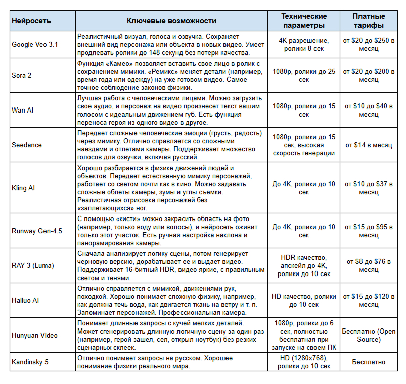 Бесплатные тарифы есть у всех нейросетей, кроме Google Veo. Но создать что-то грандиозное бесплатно не получится: долго ждать, низкое качество ролика и количество генераций, конечно, хватит разве что только на черновую версию ролика. В таблице указан средний платный тариф.