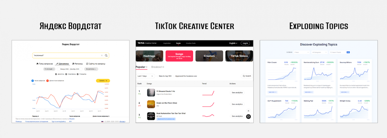 Glimpse - показывает конкретные цифры по количеству запросов и прогнозирует рост темы на месяцы вперед. Позволяет отделить мимолетный хайп от устойчивого тренда.