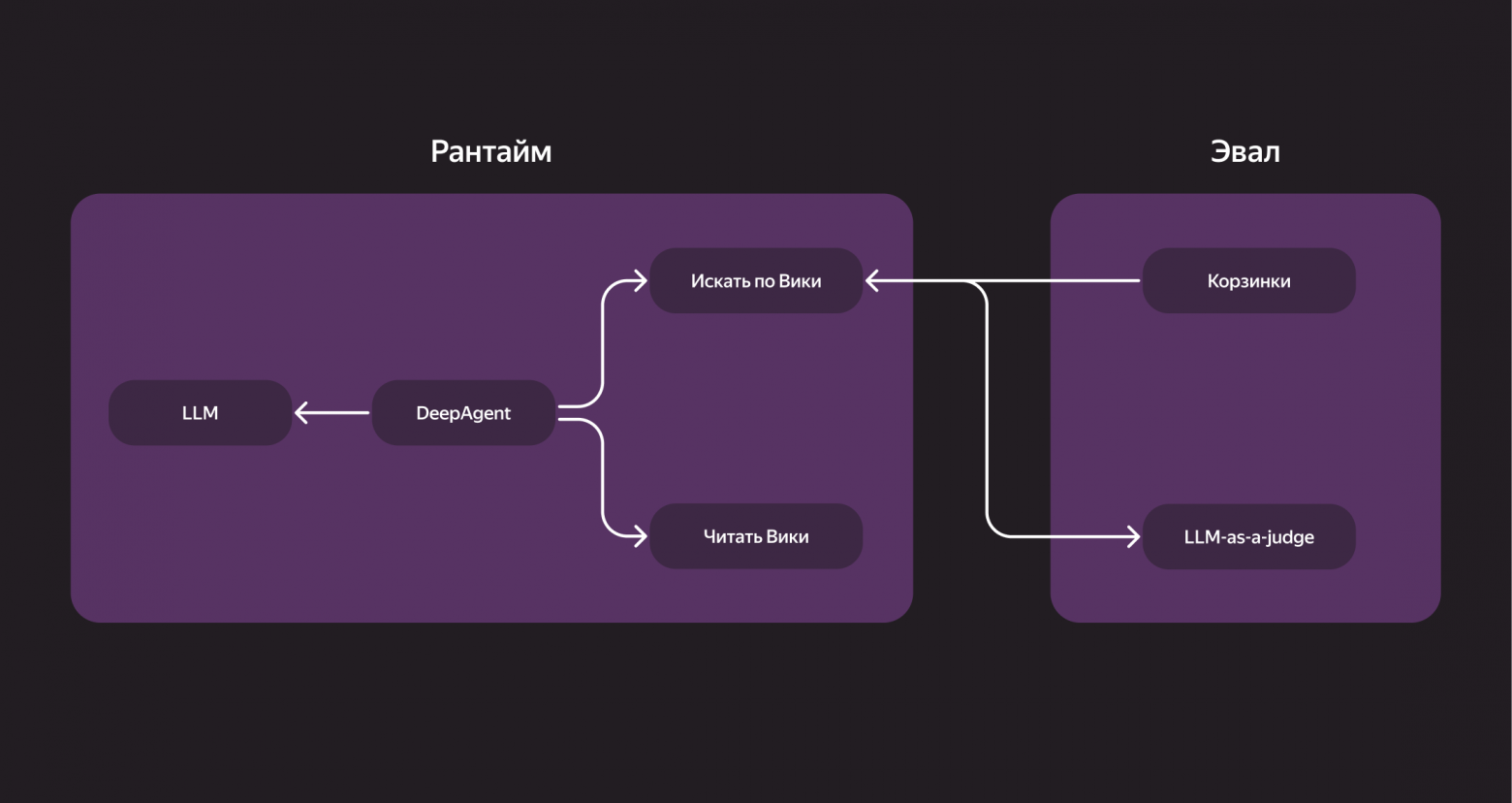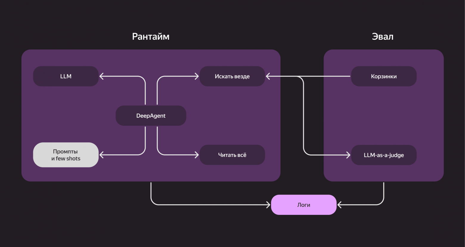 Так постепенно DeepAgent вырос до полноценного инструмента. Появились эвали, корзинки, LLM‑as‑a-judge. После каждого изменения мы проверяли качество — хотя бы не стало ли хуже, а лучше стало ли. И только благодаря этому циклу «изменил — проверил» мы вообще понимали, что движемся в правильном направлении.
