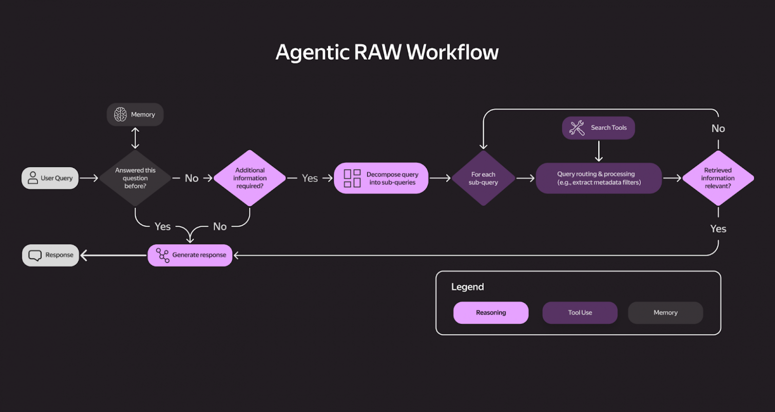 Со временем RAG эволюционировал в более сложные конструкции — то, что сейчас часто называют AI workflow. Это уже набор связанных нод и правил: одна нода переформулирует запрос, другая запускает поиск (иногда несколько раз), третья читает документы, четвёртая решает, достаточно ли информации, а пятая может снова запустить поиск, если данных не хватает. Важно: эти шаги жёстко зашиты разработчиком, и модель следует по заранее описанному маршруту.