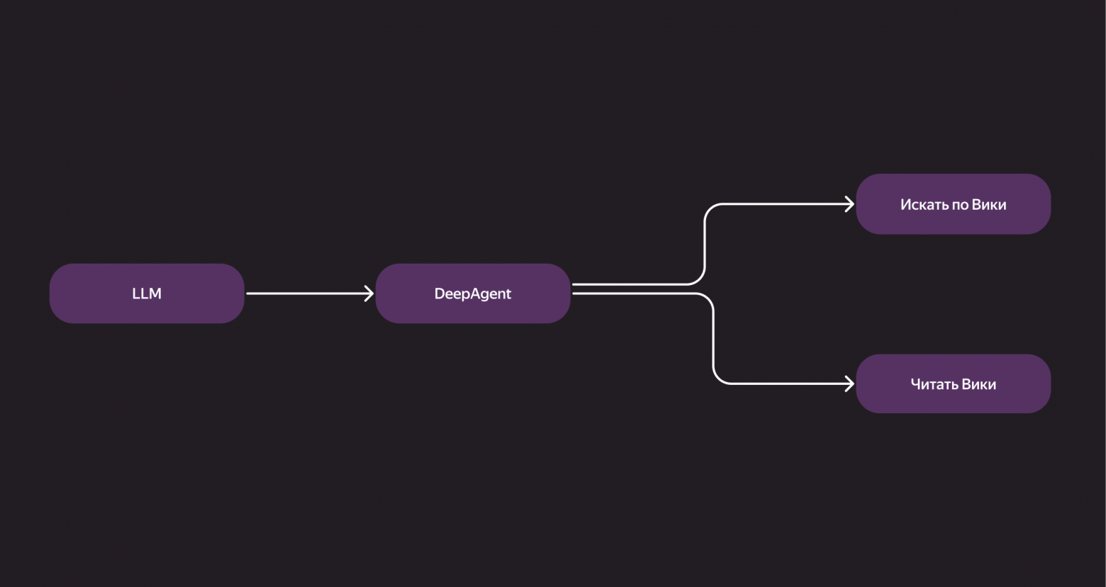 Как это было устроено технически: наш бэкенд‑DeepAgent обращался к локально поднятому поиску. Мы передавали ему инструкции вроде: «Вот, у тебя есть инструмент для поиска по Вики, можешь читать страницы — действуй, отвечай на вопросы». Дальше агент искал нужные документы, читал их и формировал ответ.