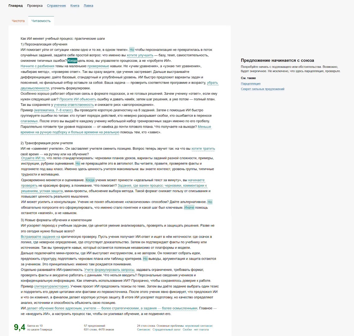 Но никогда не полагайтесь только на ИИ-корректуру. После всех правок прочитайте текст вслух. Это лучший способ поймать неуклюжие фразы и ритмические сбои.