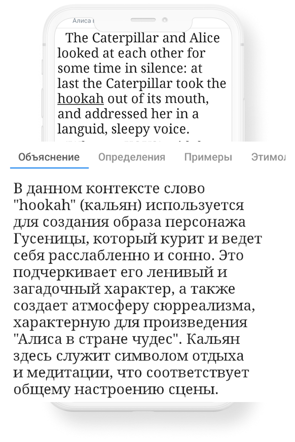 Вы можете настроить приложение так, что по клику на слово вы будете видеть объяснение, а при выделении и переводе текста вы сразу сможете увидеть грамматику.
