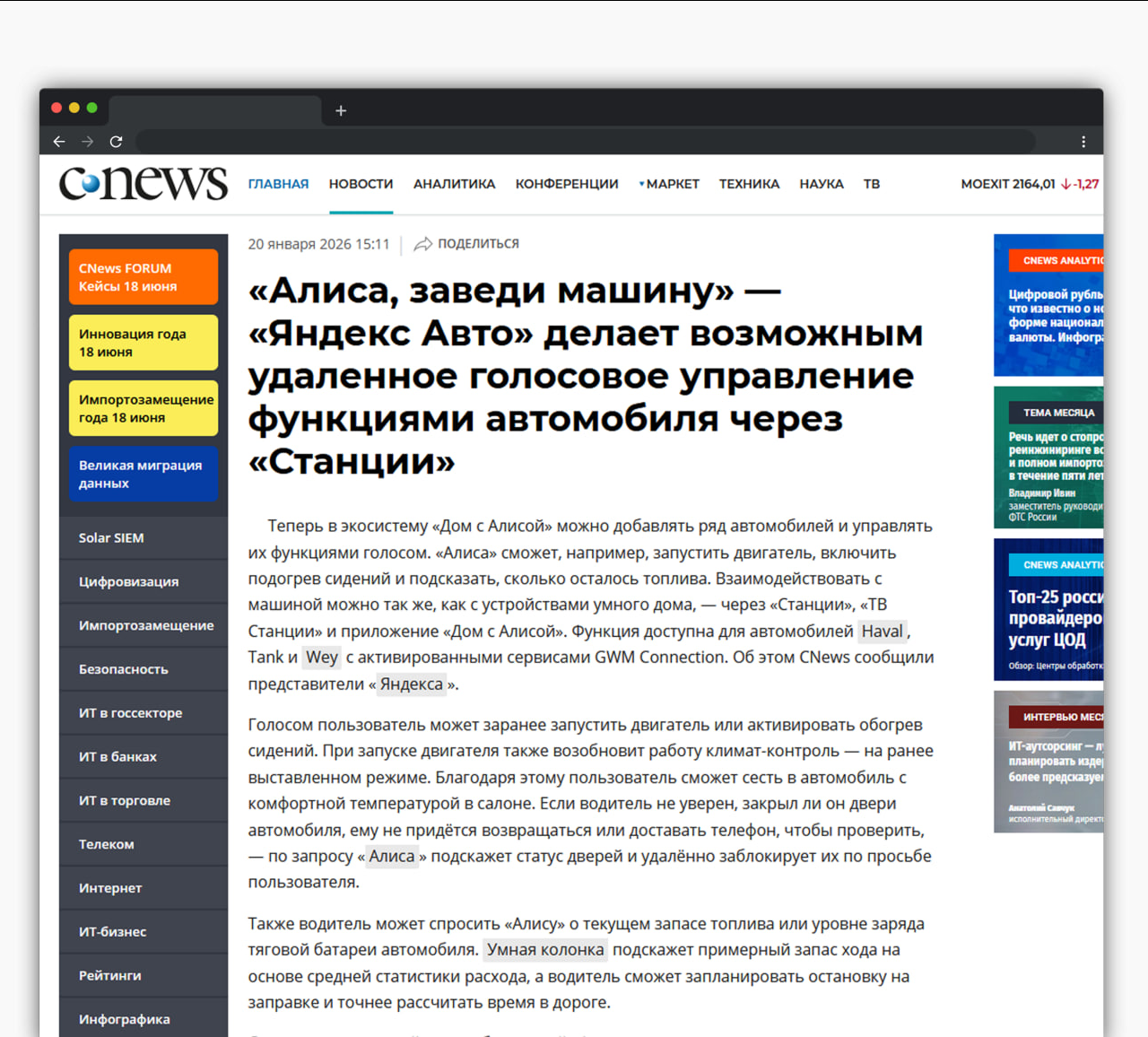 Яндекс интегрировал автомобили в экосистему «Дом с Алисой». Теперь владельцы машин Haval, Tank и Wey могут управлять ими с помощью голосовых команд через Яндекс Станцию, ТВ Станцию или приложение.
