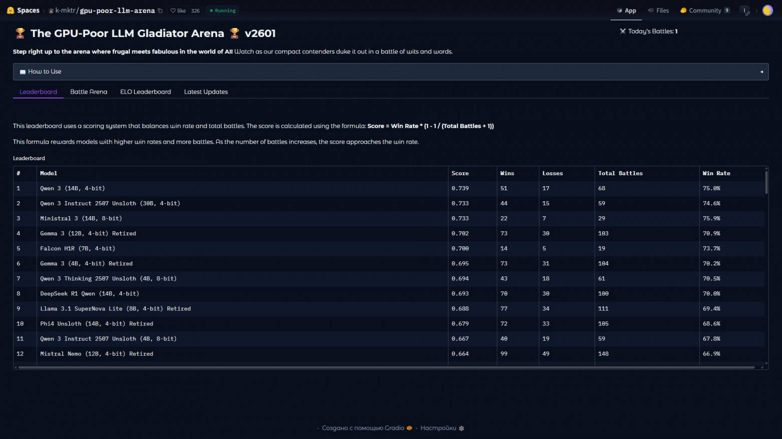 На Hugging Face появилась GPU Poor LLM Arena — площадка для сравнения языковых моделей, которые можно запустить на бюджетных видеокартах. Это своего рода LM Arena, но для бедных, где можно вживую протестировать и сравнить компактные модели.