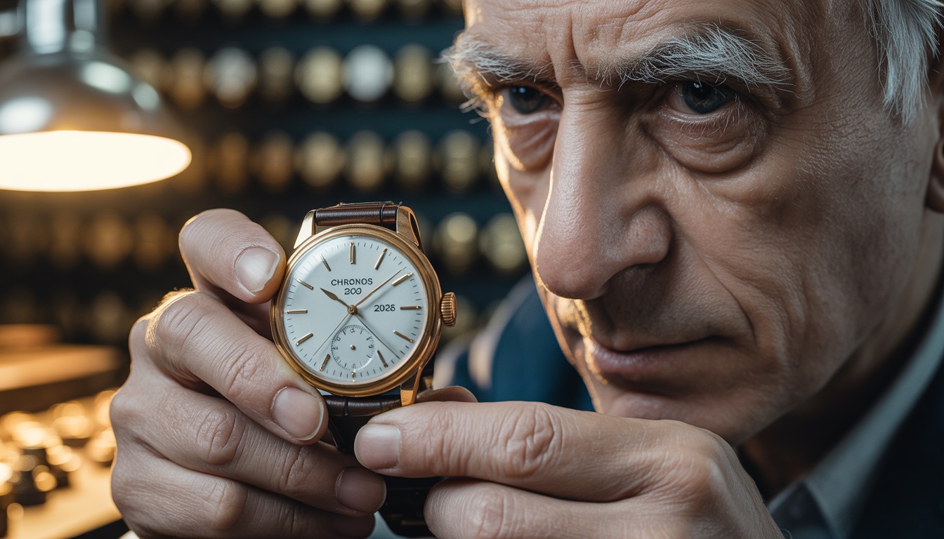 «Сделай реалистичный портрет пожилого часовщика в мастерской. Он держит в руках старинные золотые часы, на циферблате которых четко видна надпись "CHRONOS 2026".