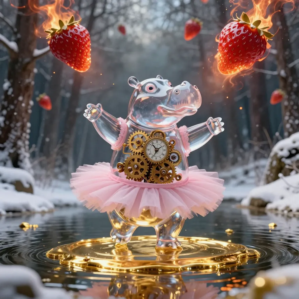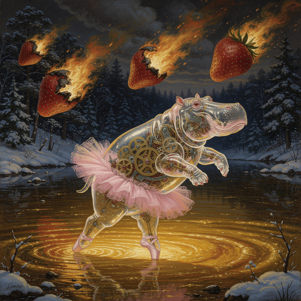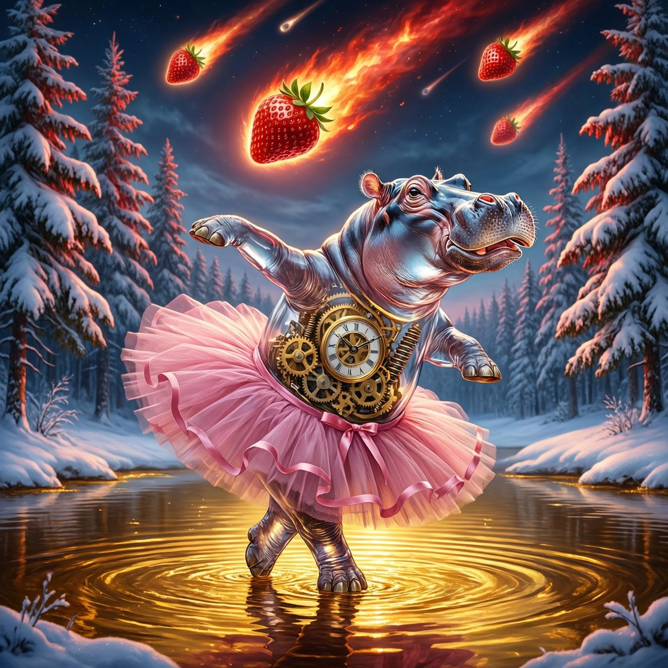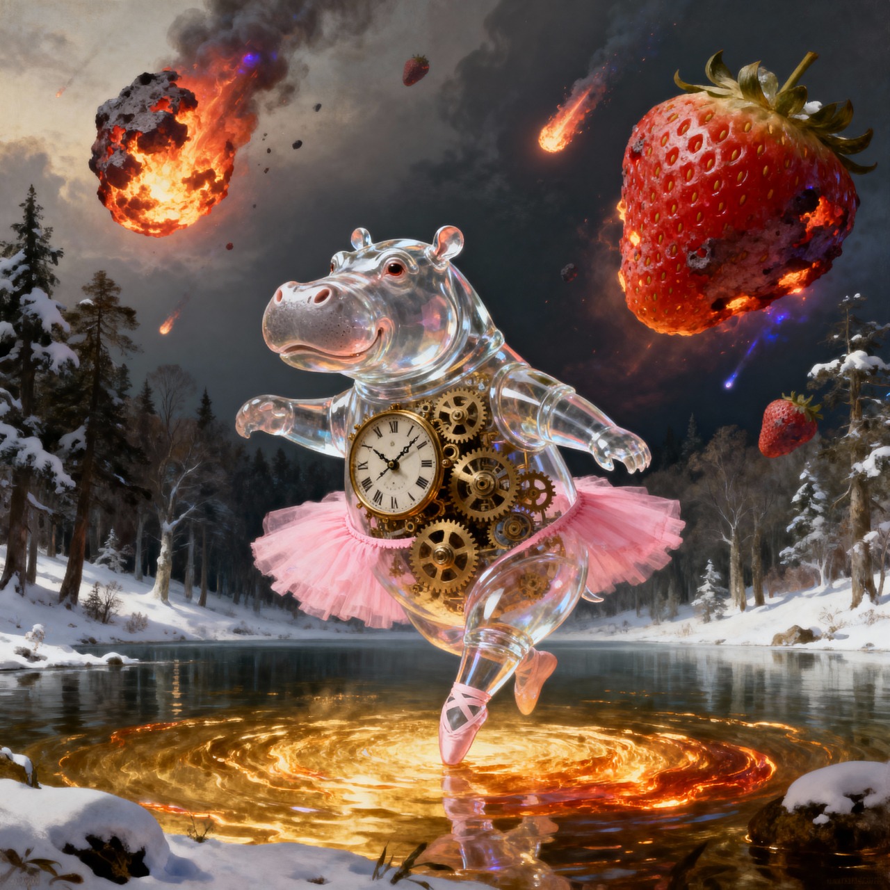 A transparent glass hippo wearing a pink ballet tutu dancing on a lake of molten gold in the middle of a snowy forest. Inside the hippo, a complex clockwork mechanism of gears is visible. Giant burning strawberry-meteorites are falling from the sky. Renaissance style, dramatic lighting, highly detailed, 8k.