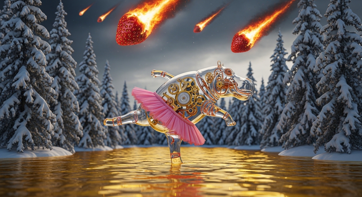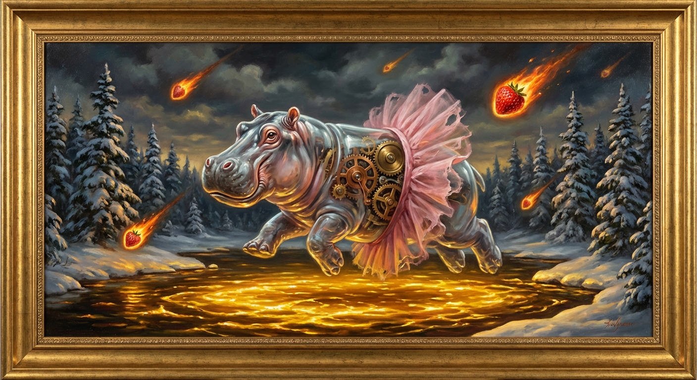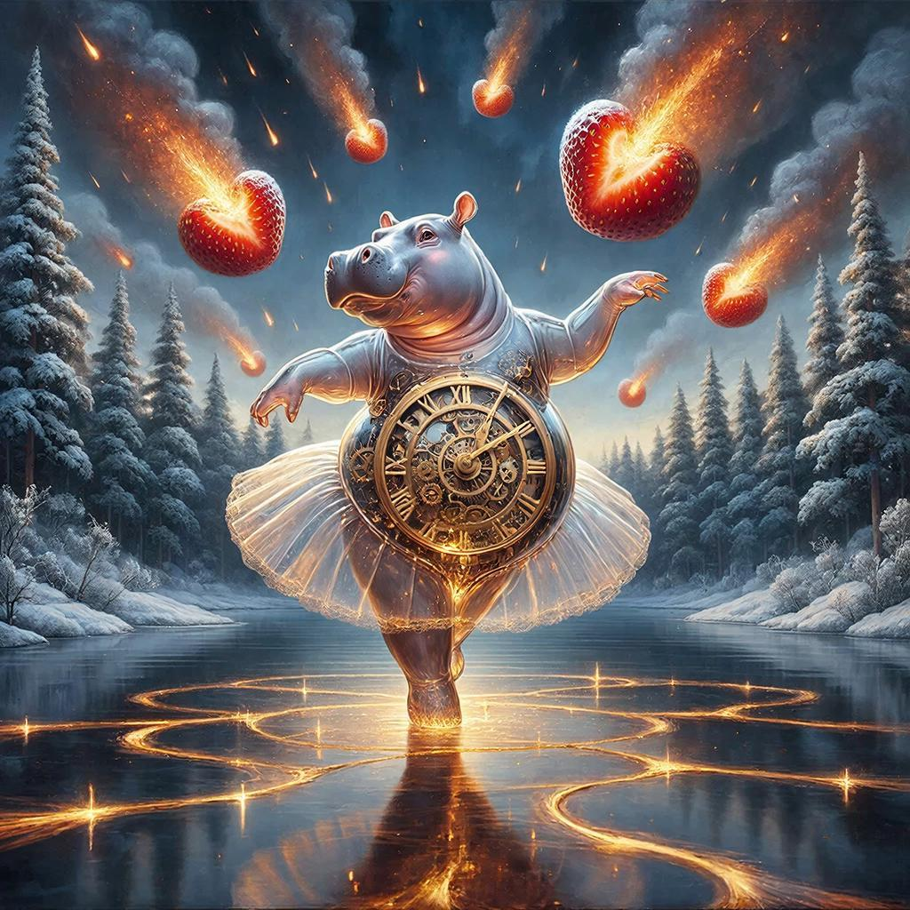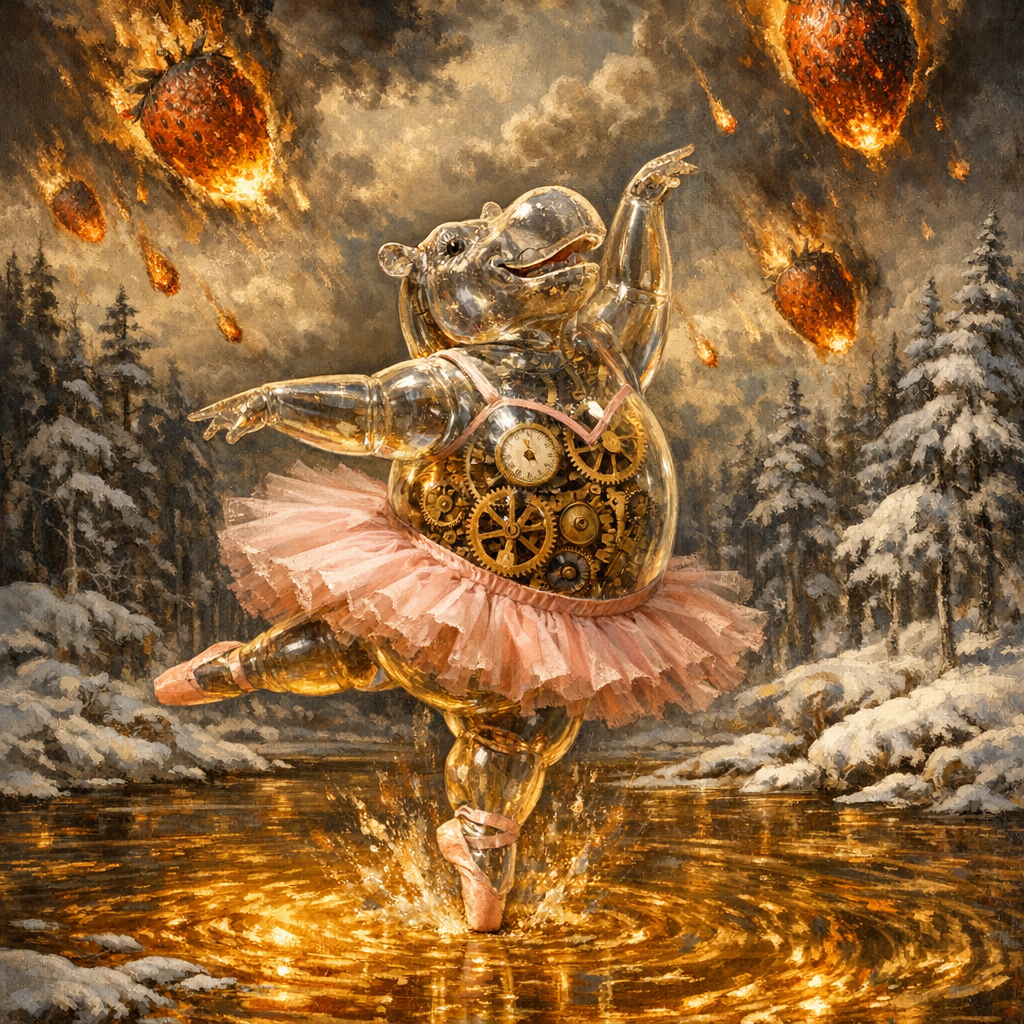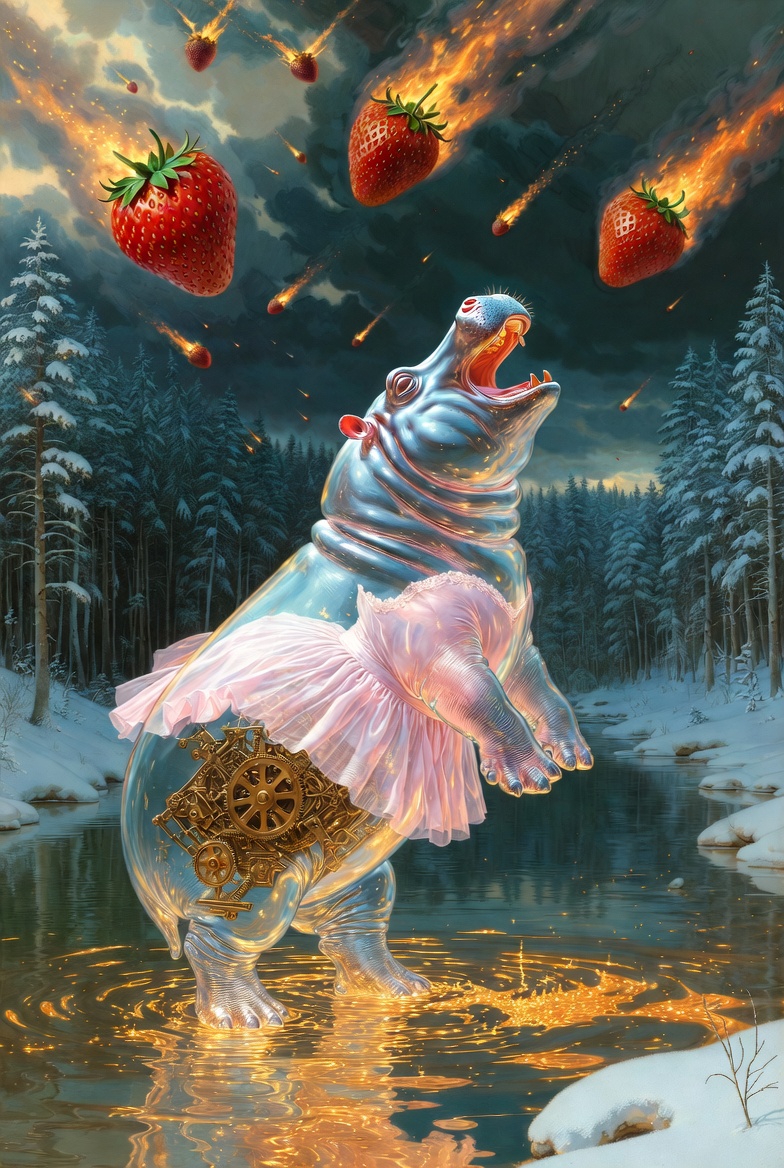 A transparent glass hippo wearing a pink ballet tutu dancing on a lake of molten gold in the middle of a snowy forest. Inside the hippo, a complex clockwork mechanism of gears is visible. Giant burning strawberry-meteorites are falling from the sky. Renaissance style, dramatic lighting, highly detailed, 8k.
