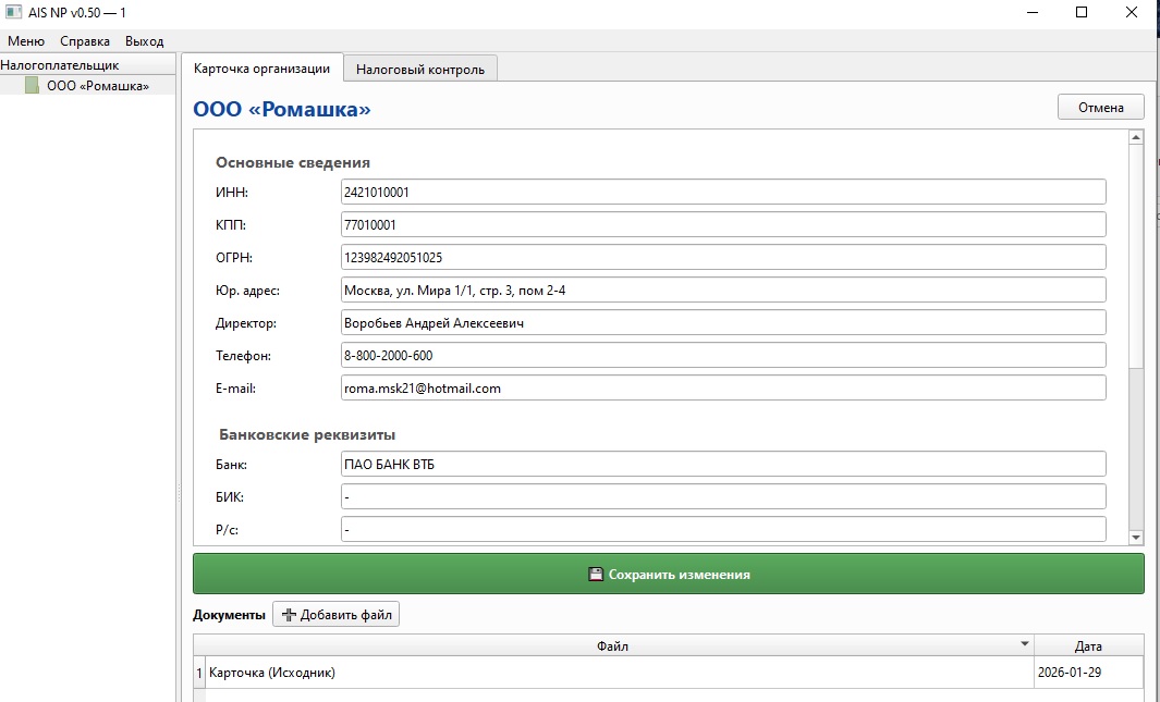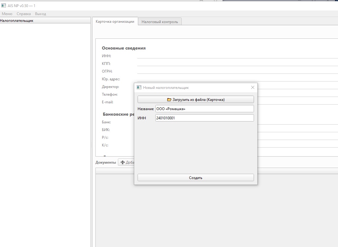 Работа в AIS NP начинается с добавления организации. Организацию можно завести вручную (минимум: название и ИНН), а можно загрузить карточку из файла.