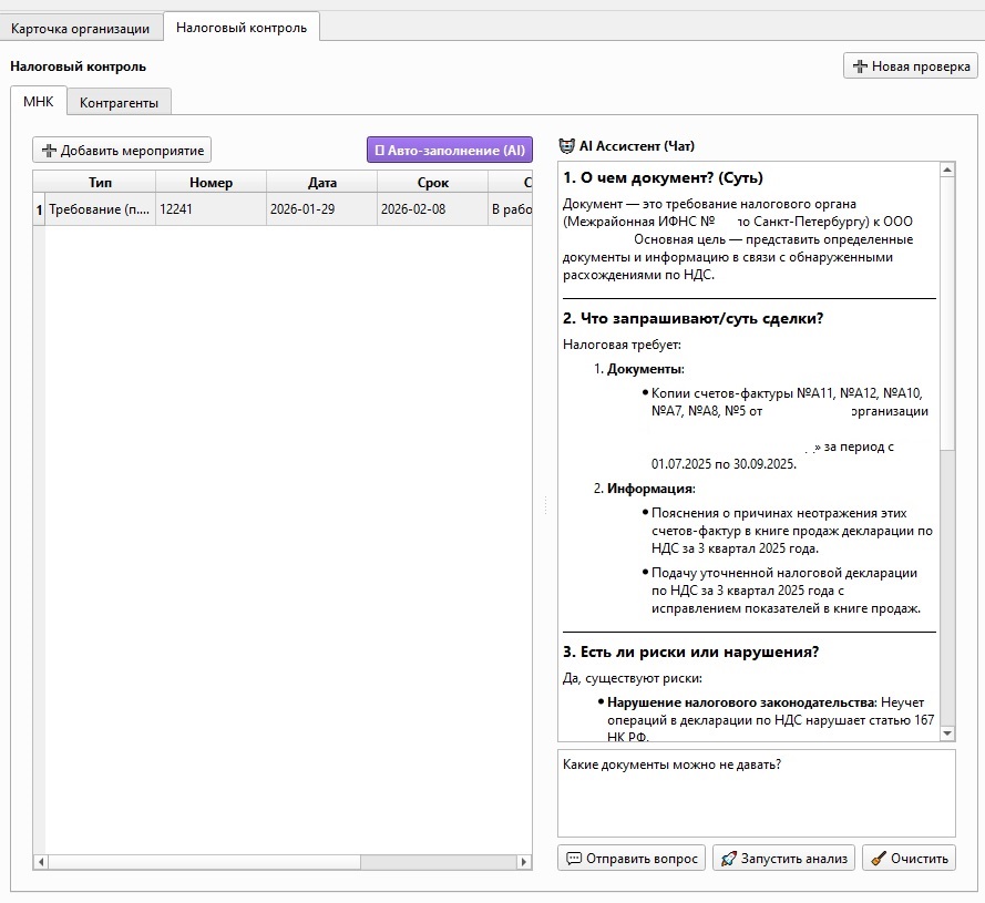 AI-модуль помогает анализировать входящие документы, формулировать подсказки, выделять проблемные места, помогать с подготовкой черновиков и комментариев. И он не заменяет специалиста — он снимает часть нагрузки там, где обычно уходит время на «первичную обработку» входящего материала. И кроме того, доступен режим чата, в котором можно более детально проработать поступившее требование или составить ответ.