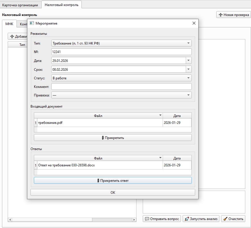 фиксировать мероприятия налогового контроля (требования, пояснения, вызовы и т.д.) и видеть их сроки и статусы;