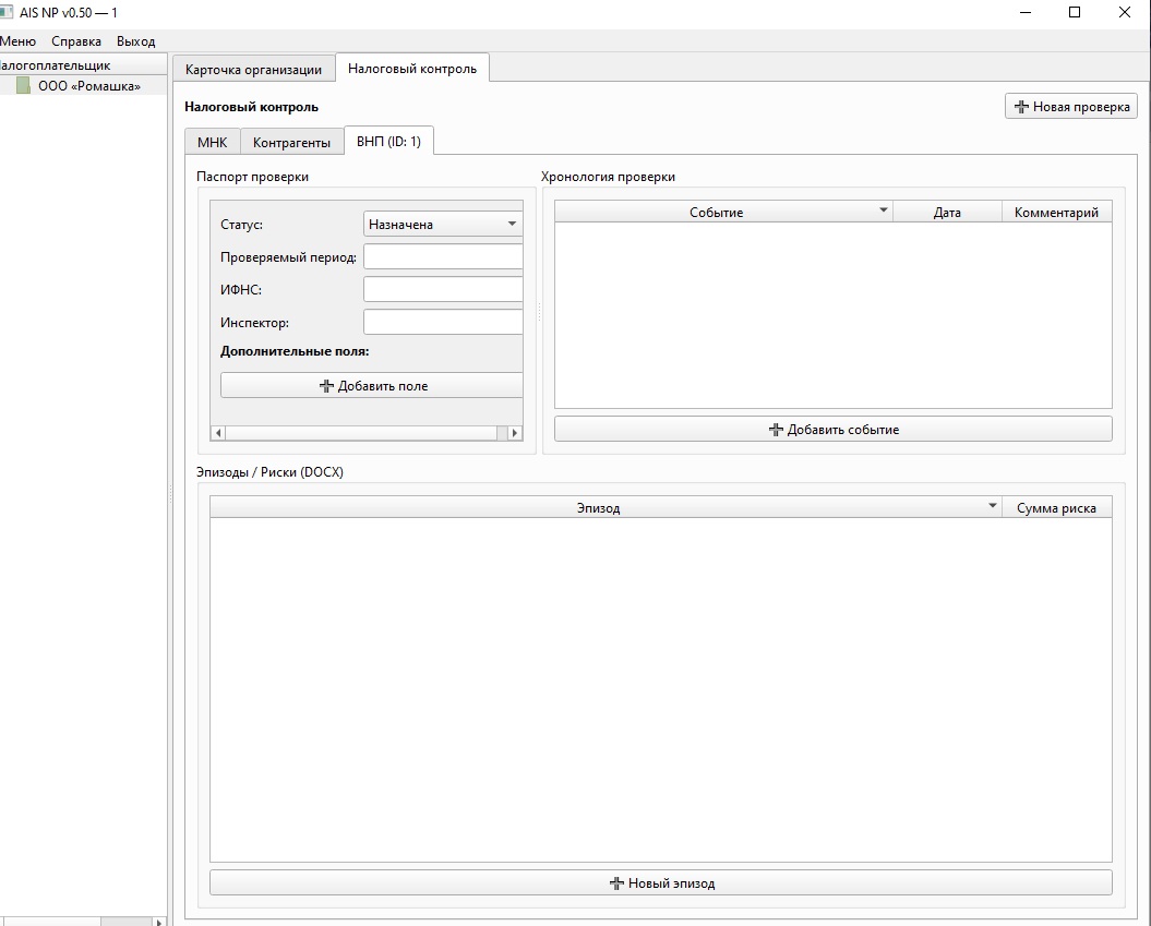AIS NP поддерживает работу с проверками (для них вообще и создавался): ВНП и КНП ведутся как отдельные кейсы со структурой: паспорт проверки → хронология → эпизоды/риски. Хронология позволяет фиксировать ключевые события проверки, а эпизоды — разложить проверку по смысловым блокам и вести материалы структурно.