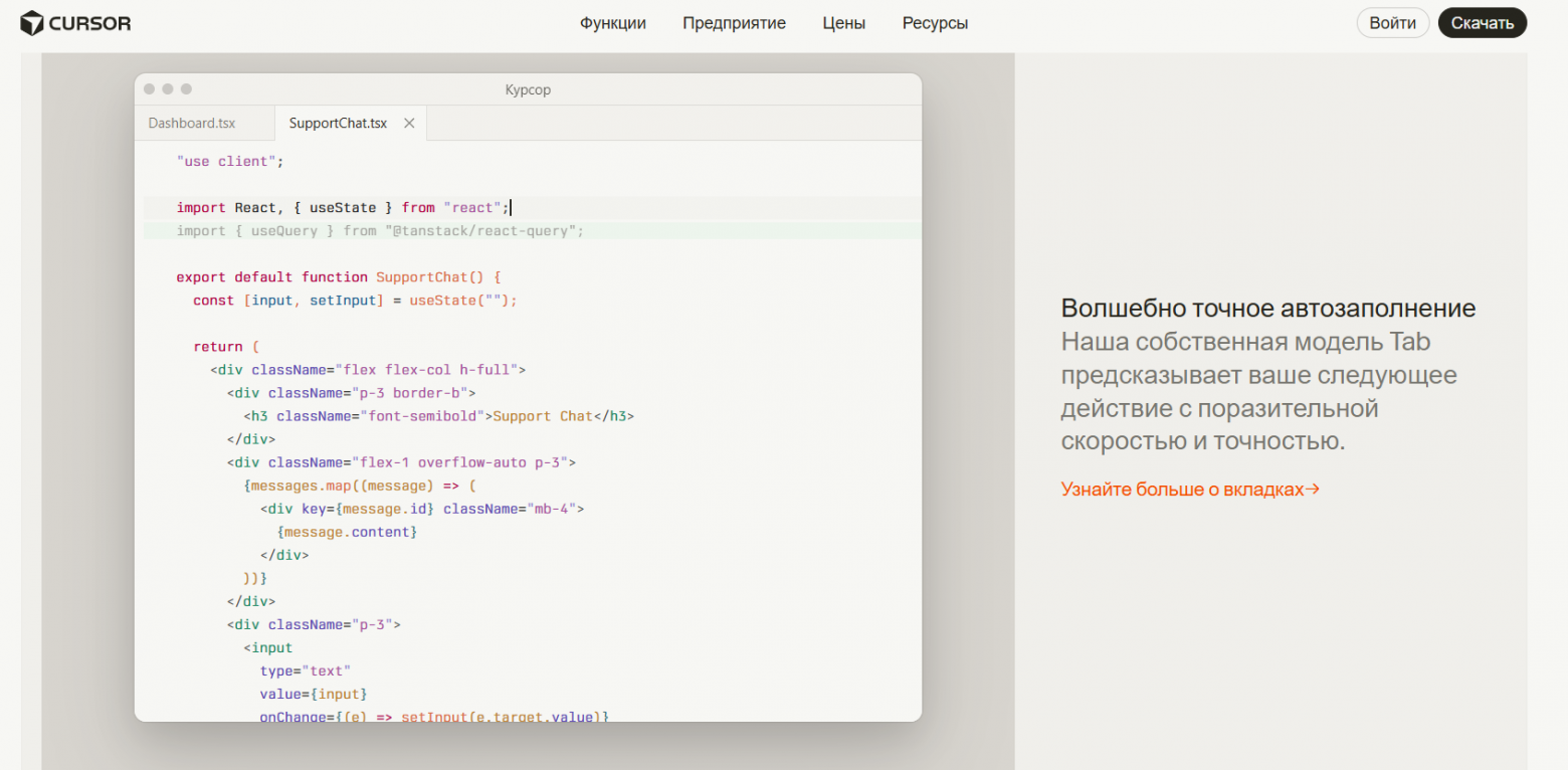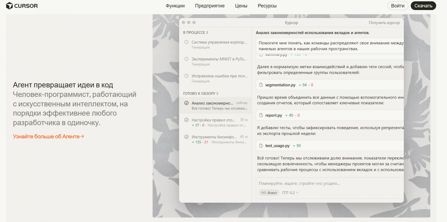 На седьмом месте рейтинга Cursor. Это решение для другой, не менее важной аудитории: разработчиков и технических специалистов. Если вы проектируете интерфейс для нового продукта, создаете прототип веб-приложения или автоматизируете внутренние процессы, Cursor станет вашим союзником. Это интеллектуальная среда разработки, созданная на базе популярного VS Code, которая встроила мощный ИИ непосредственно в ваш рабочий процесс.