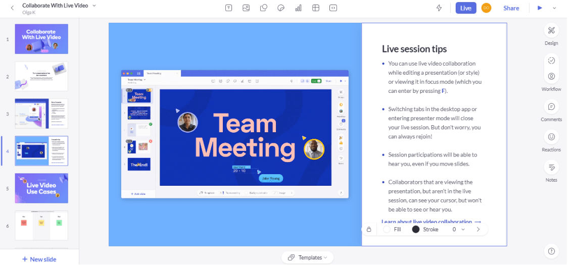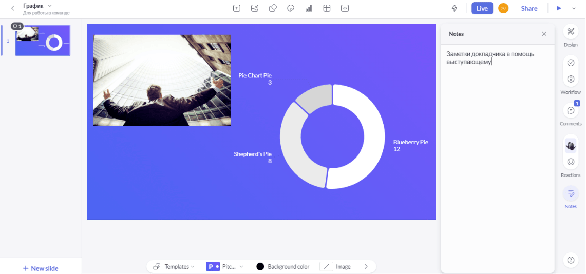 Молниеносная совместная работа. Несколько человек могут одновременно редактировать одну презентацию, оставлять комментарии к конкретным элементам и назначать задачи прямо на слайдах.