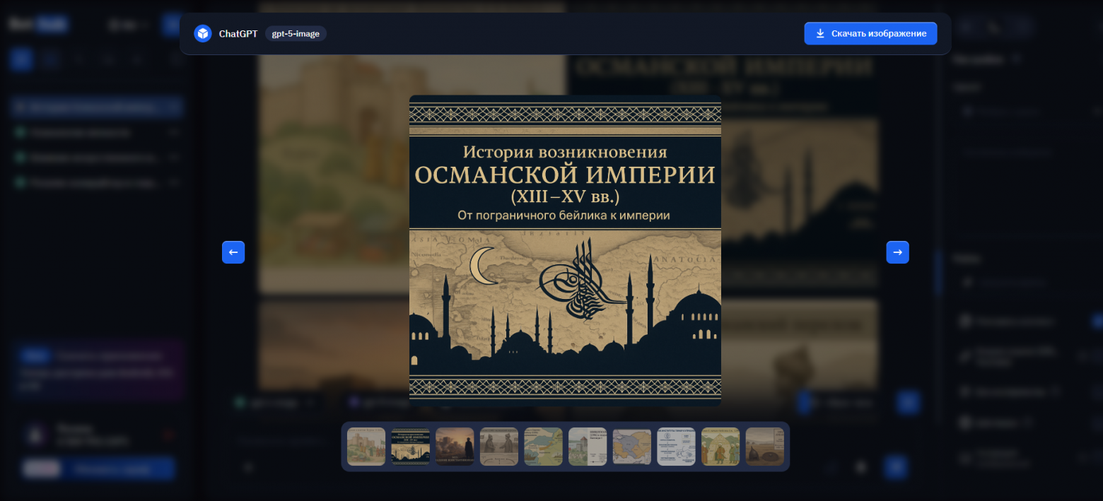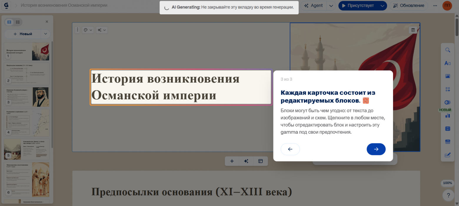 Сильная сторона Gamma - совместное творчество с ИИ. Сервис предлагает мощный конструктор, где вы можете детально управлять каждым блоком, перетаскивать элементы и вносить правки. При этом ИИ остается рядом, чтобы мгновенно переоформить слайд, переписать текст или сгенерировать изображение по запросу. Это баланс между полным контролем и магией автоматизации.