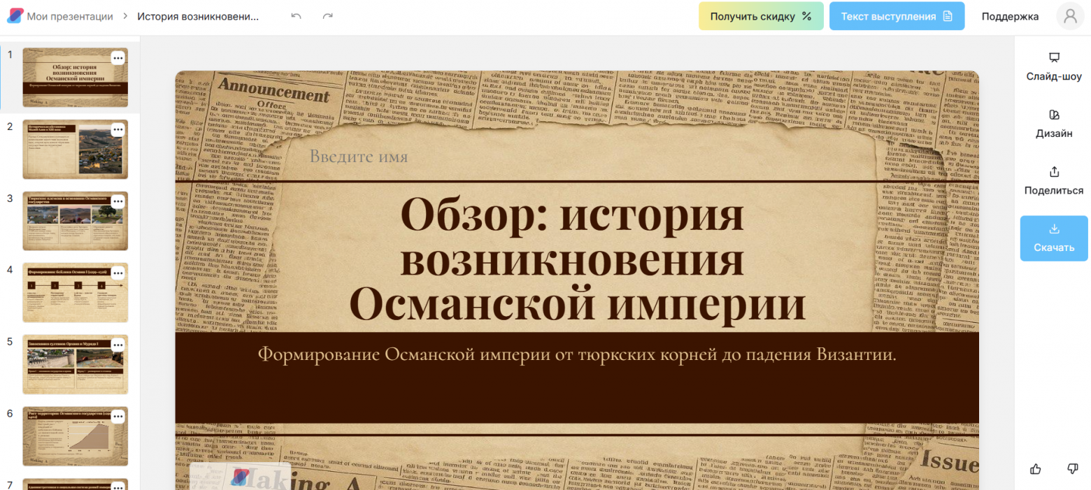 Главная фишка Сократика - скорость и фокус на сути. Вам не нужно разбираться в десятке настроек. Просто заходите на сайт, вбиваете тему презентации, выбираете количество слайдов, дизайн, и через минуту ИИ уже показывает вам готовый план. Да-да, не сами слайды, а сначала план. Это гениально просто, вы можете сразу убрать лишнее, добавить свой пункт или поменять порядок, и только потом нейросеть создаст полноценные слайды. Это спасает от ситуации «ой, все не так, переделывай».