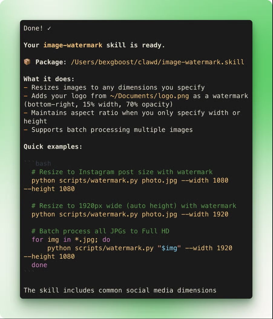 Skill можно писать как в ручную, так и с помощью самого OpenClaw. Описываешь ему задачу в чате, говоришь - "реши мне ее и запомни как это сделал". Например - "Создай skill для ресайза изображений с водяным знаком". OpenClaw через встроенный skill-creator сам напишет скрипт, сгенерирует структуру и создаст SKILL.md с примерами (успешность, конечно, зависит от твоей задачи).