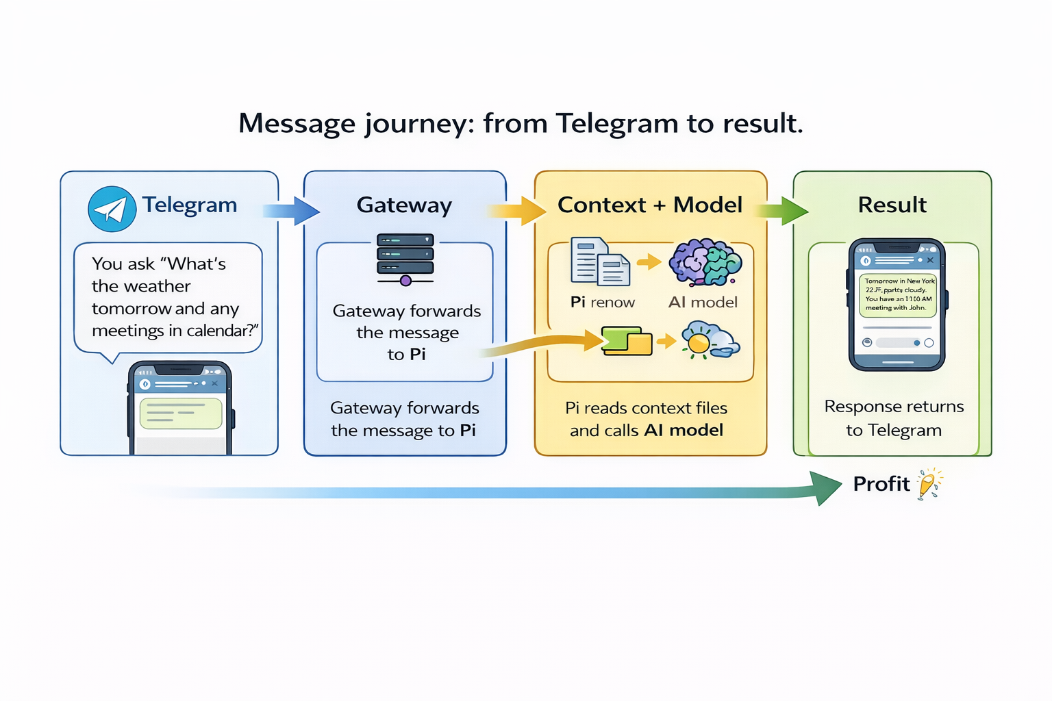Gateway определяет вашу сессию и передаёт сообщение в Pi.