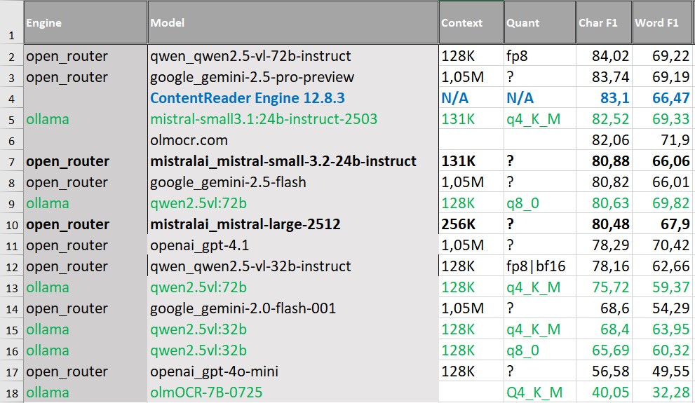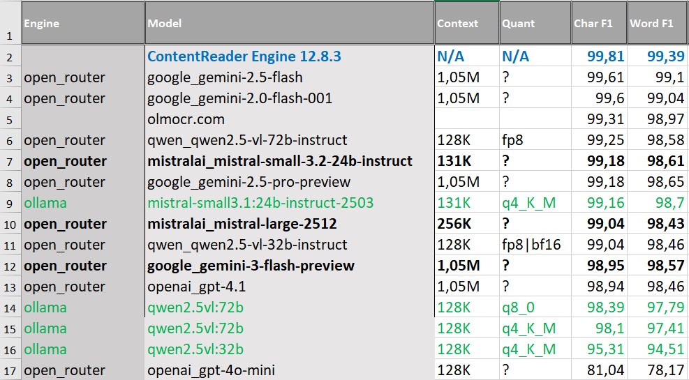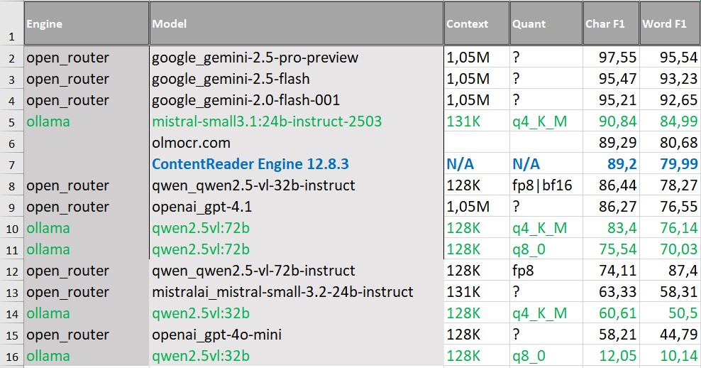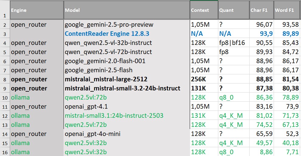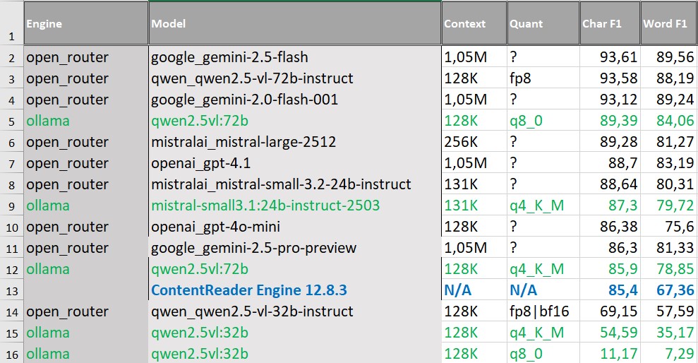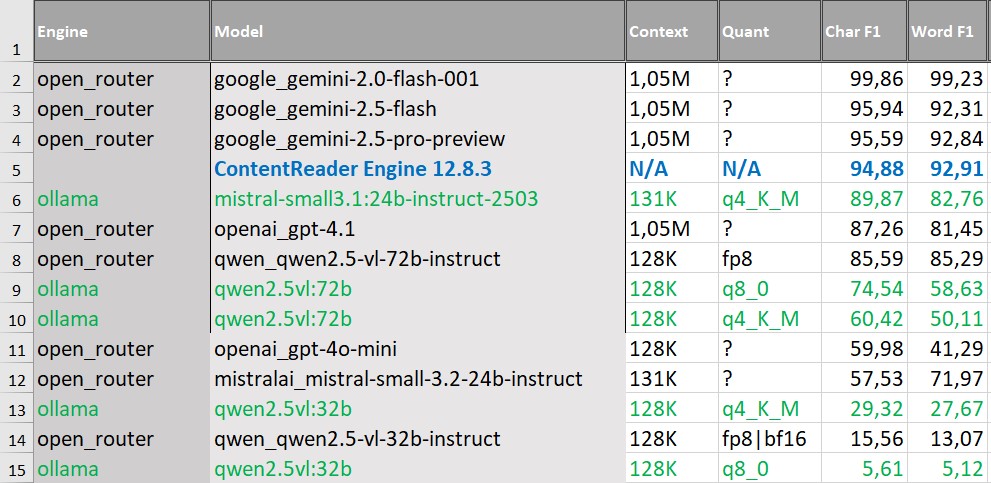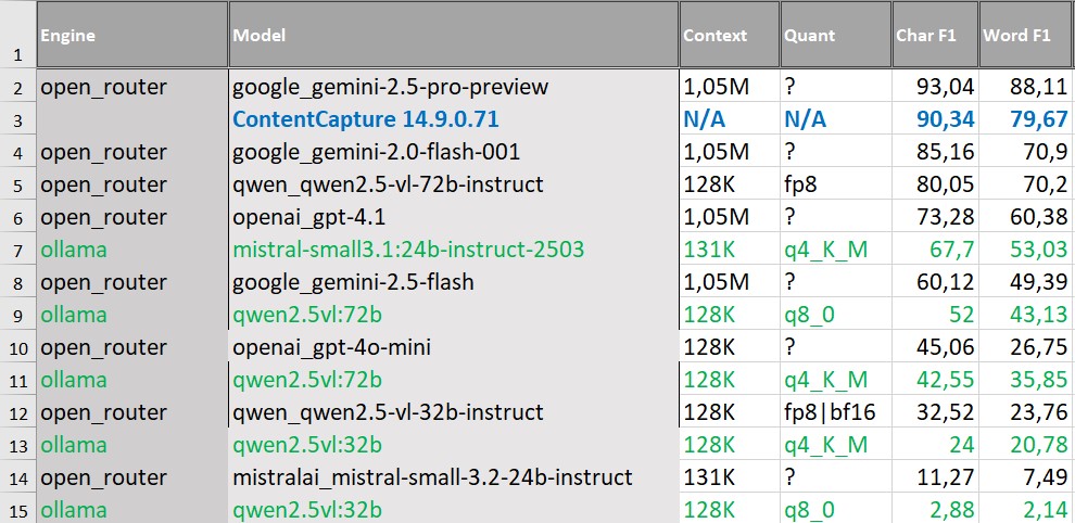 Наилучшие результаты демонстрируют крупные VLM, в частности Gemini 2.5 Pro Preview. IDP-платформа ContentCapture занимает вторую позицию, а разрыв между лидерами и остальной частью таблицы здесь значительно больше, чем в тестах на печатных документах. Это показывает, что рукописный текст остается областью, где VLM действительно дают преимущество за счет работы с контекстом и способности восстанавливать смысл при низком качестве отдельных символов.