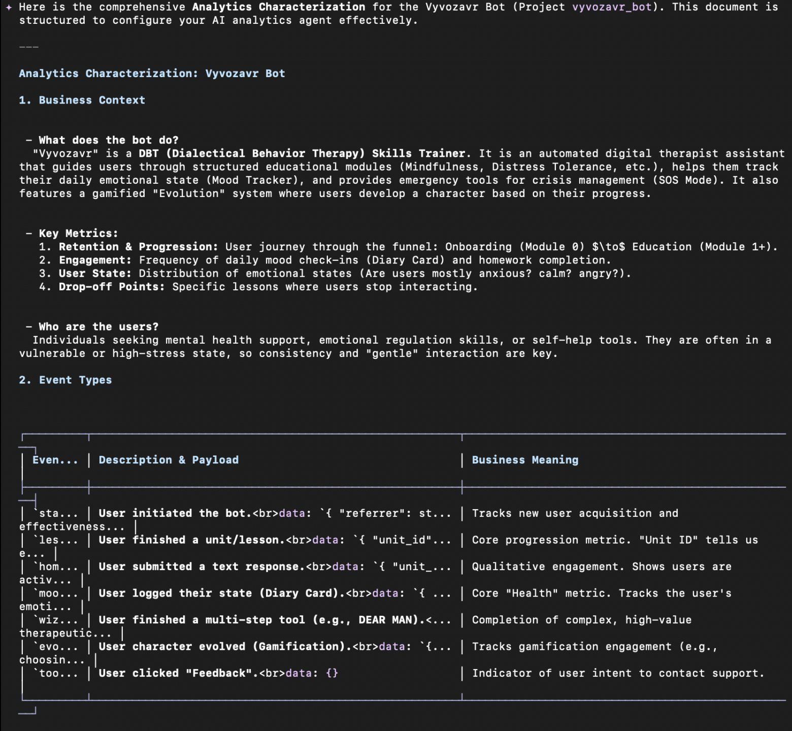 Это полноценный учебный курс по ДБТ навыкам от Марша Линехан в виде телеграм бота. Сделано (почти) полностью с помощью LLM, начиная от самих уроков, заканчивая тестами и деплоем. Серьезно: автотесты сделала LLM, деплой сделала LLM. Даже продуктовая аналитика сделана на своем собственном велосипеде. Монетизации тут нет, поэтому рекламирую с чистой совестью.