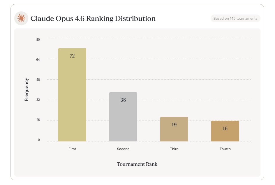 Распределение результатов Claude Opus 4.6 по 145 турнирам показывает устойчивое доминирование: модель финишировала первой в 72 случаях, второй — в 38, третьей — в 19 и четвертой — в 16. GPT-5.2 от OpenAI в общем рейтинге оказалась только на 11-м месте (1277 баллов в варианте XHigh), а GPT-5 (High) — на 19-м с 1263 баллами.