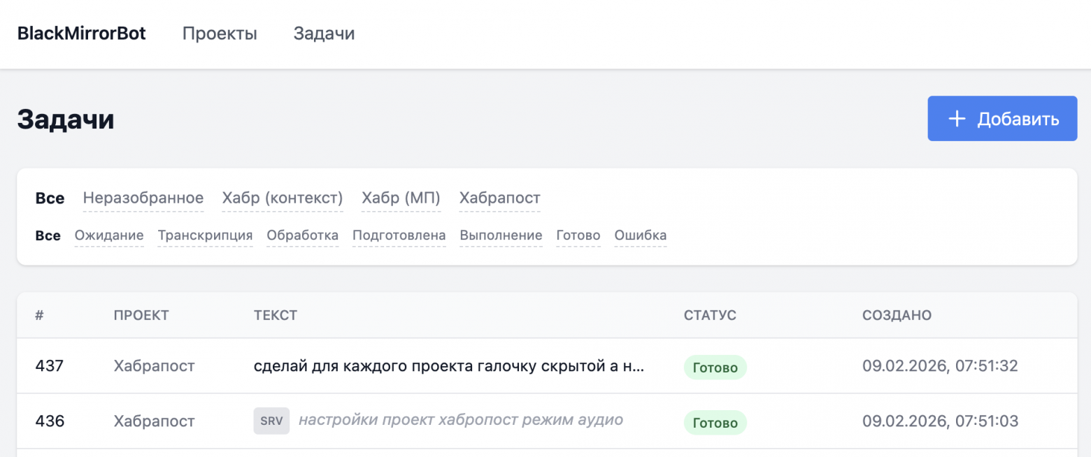 Результат в задаче: исходное аудио, транскрибация, рефайн, история и итоговый результат. И да, про бд в браузере — это я не поехавший, сейчас реально в браузерах есть встроенные sql-style базы помимо localstorage. Итоговый скриншот задачи для залипания: