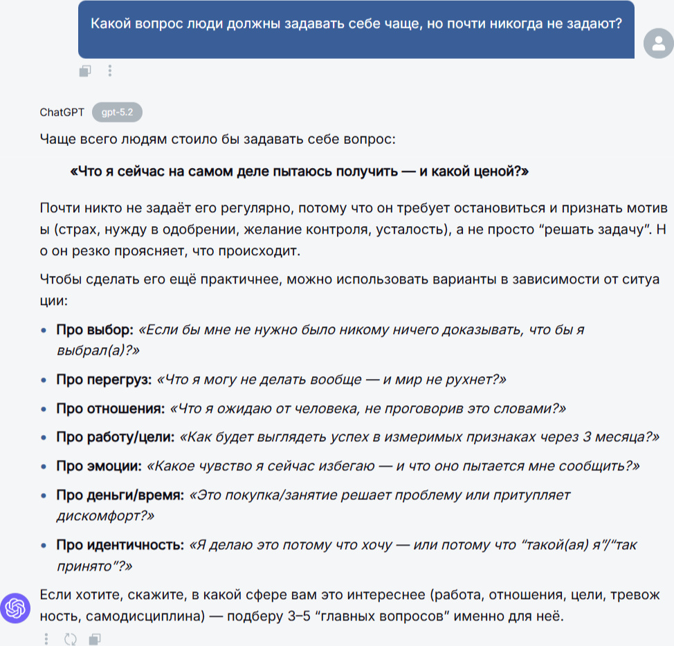 ChatGPT 5.2 и Claude Opus 4.6 пошли другими путями. Первый предложил практичную, почти инструментальную рамку. Его вопросы – это рабочие инструменты для принятия решений здесь и сейчас. Второй же погрузился в философскую археологию убеждений, звучал сдержанно и интеллектуально.