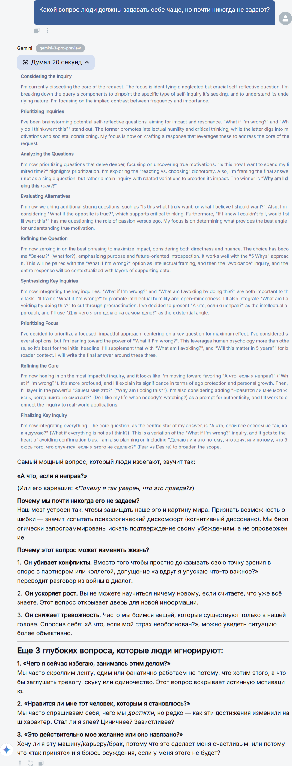 Gemini 3 Pro сделал ставку на психологическую глубину и эмпатию. Много объяснений, жизненных примеров и мягких выводов – текст, который хочется применить к себе. Это сильный ход для мотивационных и рефлексивных задач, хотя иногда кажется, что ответ слишком отполирован, будто его цель – понравиться абсолютно всем.