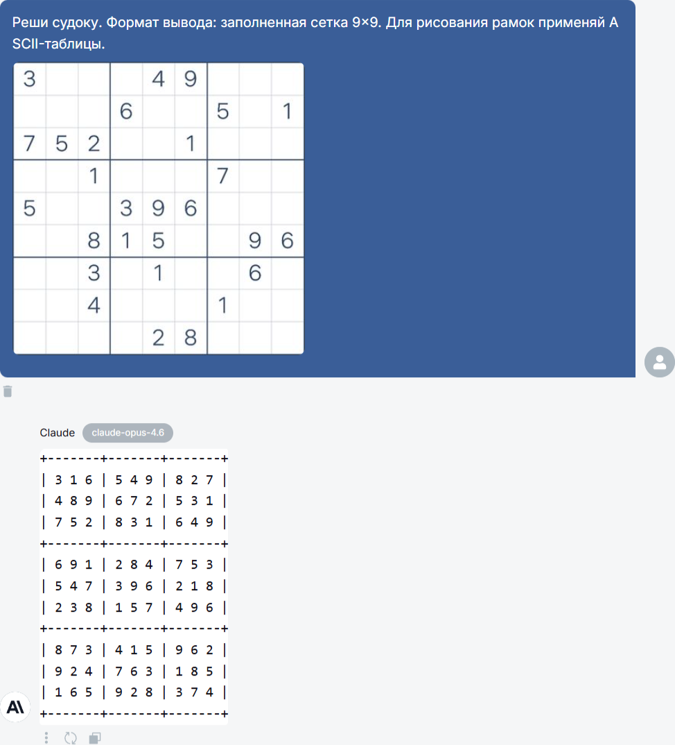 А вот ChatGPT 5.2 и Claude Opus 4.6 справились блестяще. ChatGPT выдал полное и точное решение уже через пару минут. Claude ответил почти сразу следом – и его ответ полностью совпал. Оба решения были стопроцентно корректны – все строки, столбцы и блоки 3×3 сошлись.
