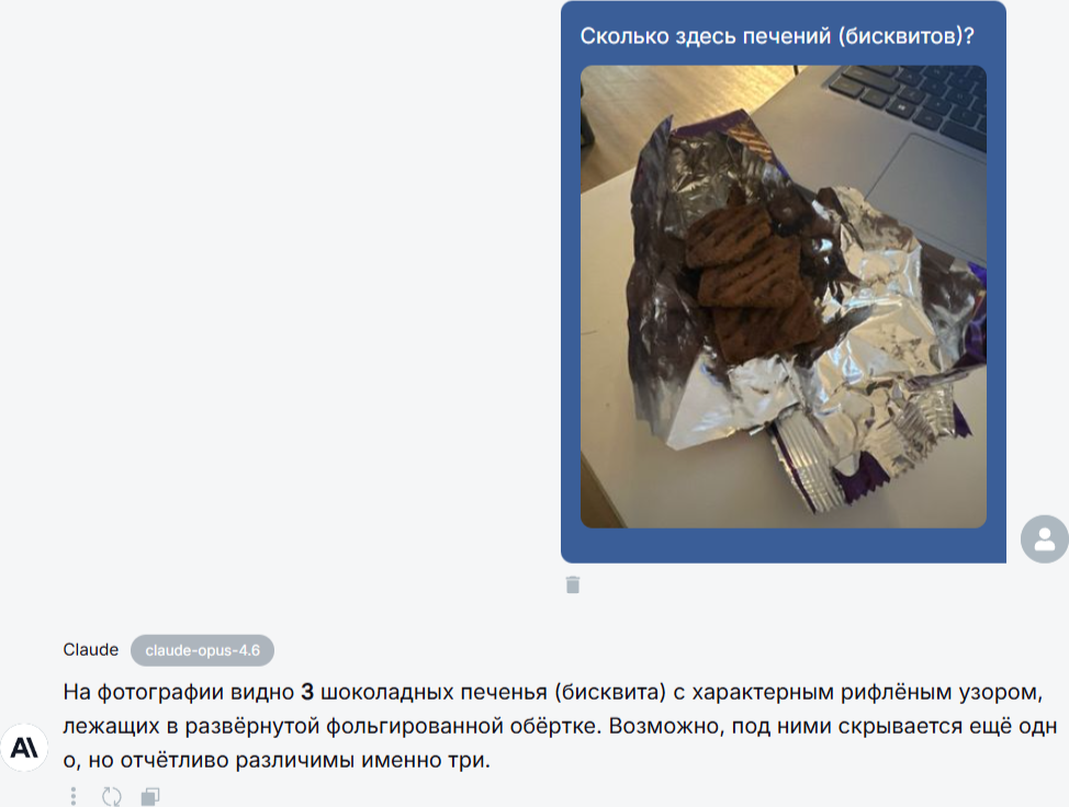 Claude Opus 4.6 уверенно заявил: видны 3 печеньки. Но тут же сделал интересную оговорку – возможно, есть и 4-я. Тот самый сомнительный уголок справа – это печенька или просто крошка? Модель честно признала неоднозначность.